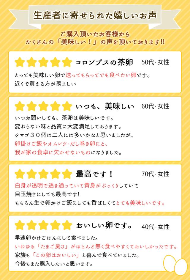 生臭さのない濃厚な味わいは、特に卵かけごはんにする方から絶賛していただいております。