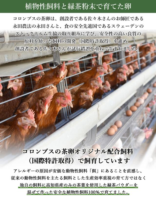 そんなコンセプトを夢に描き、コロンブスの茶卵創業者である佐々木さんは、アトピーのお子さんでも食べられる美味しい卵づくりに励み、植物性飼料100%という固定概念にとらわれない常識外れな育て方を研究しました。