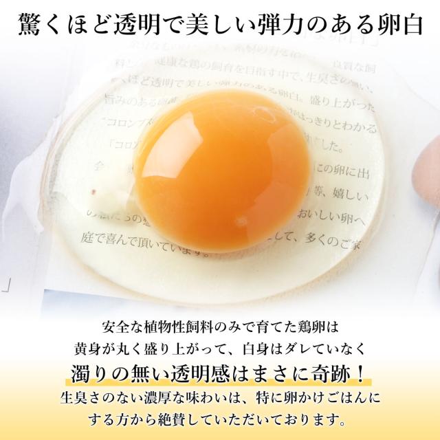 コロンブスの茶卵創業者である佐々木さんは、アレルギーの原因が安価な動物性飼料「餌」にあることを直感し、従来の産卵効率を重視する海外輸入魚粉などの飼料を主たる餌とした生産効率重視の育て方ではなく、安全な植物性飼料のみで育てた鶏卵は、黄身が丸く盛り上がって、白身はダレていなく濁りの無い透明感はまさに奇跡!