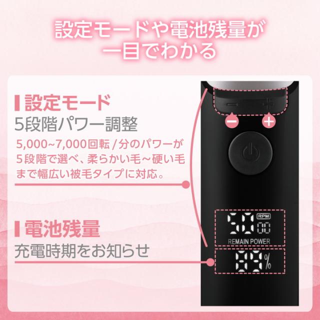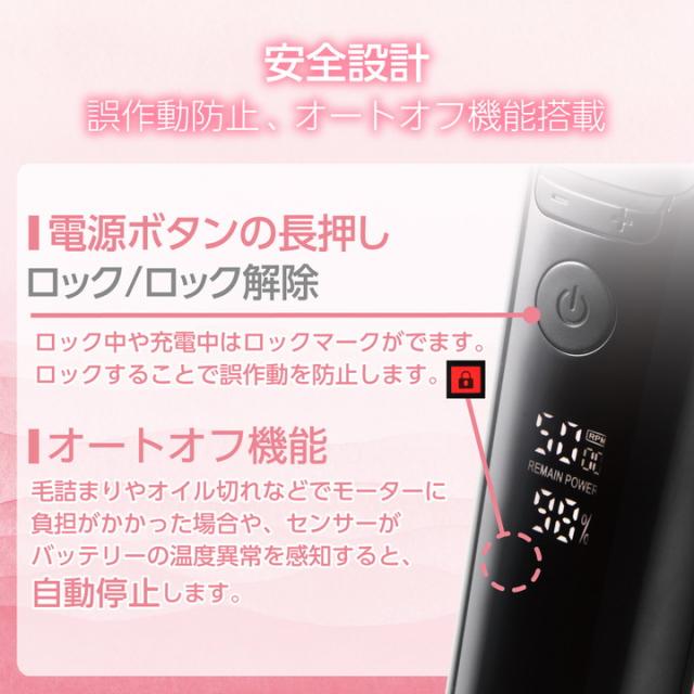 気になったらすぐ、おうちで手軽にトリミング。安全設計で使いやすい、ペット用コードレスバリカンです。ペット専用に開発された切れ味の良いセラミック刃で、伸びた毛をスムーズにカット。誤作動や電池の劣化を防ぐ安全機能を搭載し、ご自宅でのワンちゃん・ネコちゃんの健康維持をサポートします。![]() ■USB充電で場所を選ばず使える。手軽に伸びた毛をカットできる、ペット専用コードレスバリカンです。 ■トリミングで皮膚や被毛の健康維持をサポート。ワンちゃん・ネコちゃんの抜け毛やムダ毛を除去することで通気性が良くなり、衛生的で快適に過ごせます。長すぎる毛はフローリングで滑ることもあり、けがの原因にもなるため、定期的なトリミングが大切です。 ■ペット専用に設計された、切れ味の良いセラミック刃を採用。太い毛や密集した毛でも引っ掛かりを抑え、ストレスなくスムーズにカットできます。刃の長さは手元のスライドボタンで4段階に切り替え可能で、足裏など短くカットしたい場所でお好みの毛の長さに調節できます。 ■刃を動かすモーターの回転スピードを切り替えて、切れ味や動作音を調節可能です。5,000〜7,000回転/分のパワーを5段階で設定でき、毛の硬さや量、振動音などに合わせて調節できます。 ■部位やスタイルに合わせて付け替えられる4つのアタッチメント付き。3mm/6mm/9mm/12mmから選べて、毛の長さを整えられます。 ■LEDディスプレイで、設定したモーターの回転スピードや電池残量、ロックの状態などをひと目で確認できます。 ■カットが終わったら、刃先を取り外して水洗いOK。衛生的に使えます。 ■※製品本体は洗えません。 ■1回30分の連続使用が可能。1回の充電で最大180分間使うことができ、全身の気になるところをしっかりお手入れできます。 ■※一般的にバリカンは長時間連続使用すると上下の刃に摩擦熱が生じて刃が熱くなります。ワンちゃん・ネコちゃんの安全のために1回の使用は30分までとし、刃が熱くなったら一旦停止して冷ましてからお使いください。 ■動作音は約60dBとひかえめ。ワンちゃん・ネコちゃんもストレスを感じにくい音量です。 ■電源ボタンを長押しするとロックがかかり、不意の誤作動を防止します。 ■モーターとバッテリーを守るオートオフ機能を搭載。毛詰まりやオイル切れなどでモーターに負荷がかかった場合や、センサーがバッテリーの温度異常を感知すると、運転を自動で停止します。 ■電池の劣化を防ぐ過充電・過放電対策を二重で設けています。 ■本製品を充電できる、USB-A - USB Type-C(TM)ケーブルが付属しています。 ■※本製品にUSB AC充電器は付属していません。別途、USB-Aポートを備えた出力5V/1.5A以上の充電器をご用意ください。 ■バリカンのお手入れに必要な小型ブラシを付属しています。おうちで手軽にメンテナンスができて、長く使えます。 ![]() ■消費電力:約5W(最大) ■材質:本体:ABS樹脂、アタッチメント:ABS樹脂、バリカン刃:セラミック・ステンレス ■充電方式:USB充電 ■電池種類:リチウムイオン電池 ■充電時間:約150分 ■連続使用時間:30分(1回の充電で合計約130〜180分使用可能) ■モーター回転速度:5段階 ■防水性能:刃先のみ水洗い可(本体水洗い不可) ■外形寸法:幅約45mm ×奥行約45mm×高さ約180mm(本体のみ) ■重量:約250g(本体のみ) ■使用温度・湿度:温度0〜40℃・湿度20〜80%(結露なきこと) ■保存温度・湿度:温度0〜40℃・湿度20〜80%(結露なきこと) ■生産国:中国 |
