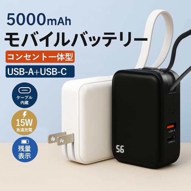 モバイルバッテリー プラグ一体型 5000mAh 15W急速充電 ケーブル内蔵 3台同時充電 Type-C対応 PSE認証 ACプラグ内蔵 小型 軽量 スマホ充電器 旅行 PSE認証