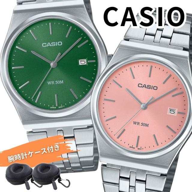 カシオ ペアウォッチ 腕時計 収納ケース付き グリーン ピンク ステンレスベルト お揃い ユニセックス メンズ レディース ペアセット カップル 親子ペア 誕生日 記念日 プレゼント ギフト ペアギフト CASIO 時計 MTP-B145D-3A MTP-B145D-4A