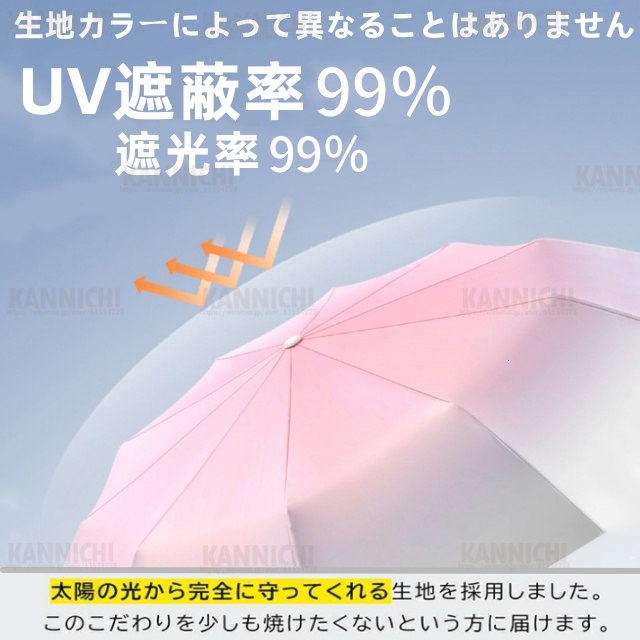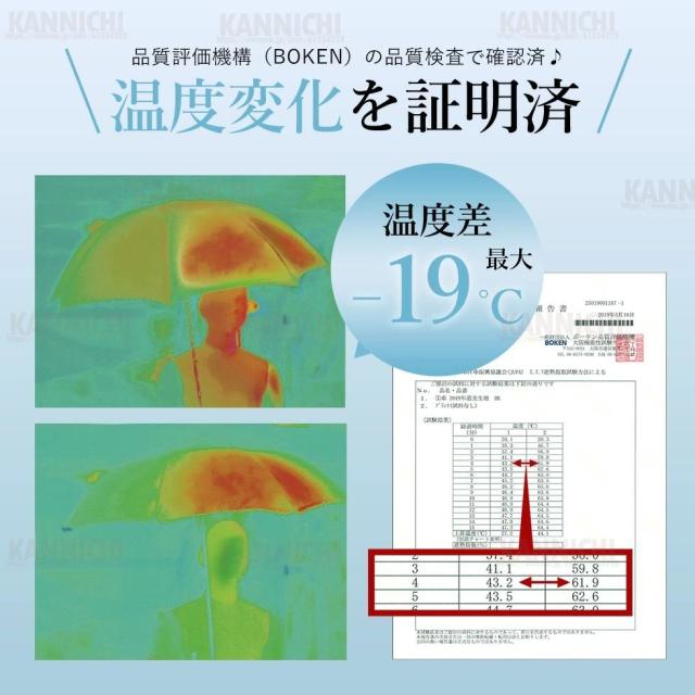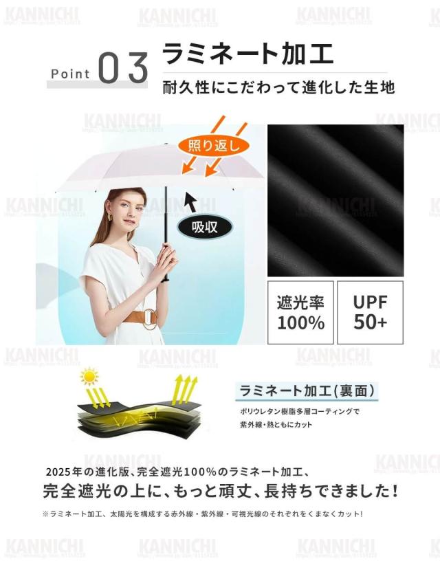デュアルコーティングを施され、表は明るめのカラーで強い日差しや紫外線を反射して熱をこもらず、裏は黒で太陽光をまったく通さず、地面からの照り返しを顔に当たらないように吸収しながら、まぶしさを軽減します。UVカット率は99.9%、UPF50+、完全遮光の高機能日傘です。