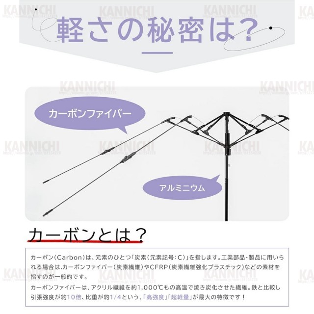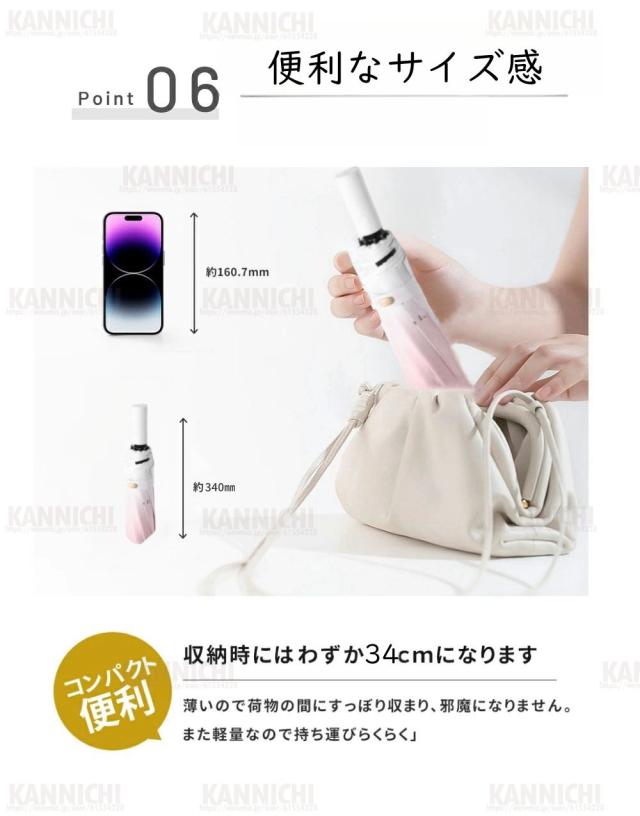 高級傘にしか使わない厳選されたカーボンファイバー採用し、毎日の持ち運びにピッタリの日傘!折りたたむ時の長さは約34cmであり、、直径約6cmであり、ショルダーバッグでさえもに楽々収納です。