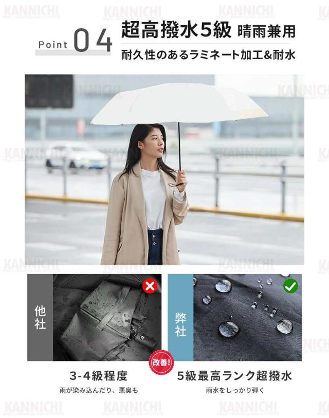 高密度生地に撥水加工で作られ、通常の日傘より撥水性に優れ、雨水が珠のように丸くなり転がり落ち、使用後も軽く振るだけで雨水がほぼ完全に消えます。一年中季節問わず使うことができ、梅雨対策にもUV対策にも欠かせない優秀なアイテム!