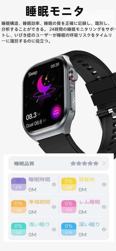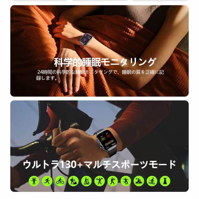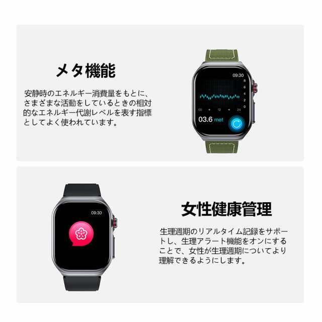 ・健康管理:体温監視、血圧測定、血中酸素、心拍計、活動量計、歩数計、音楽制御、座りがちの自動注意、睡眠モニター、運動モニター、スポーツ、カメラ操作、カロリー、睡眠の質と時間及び日常生活のさまざまなシーンで測定ができます。