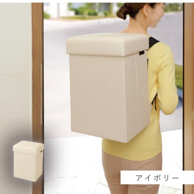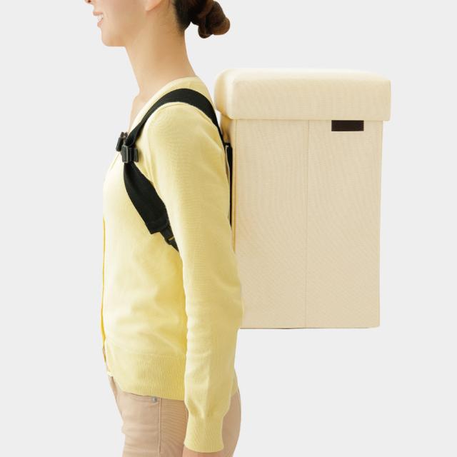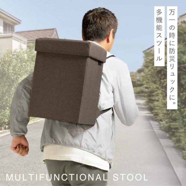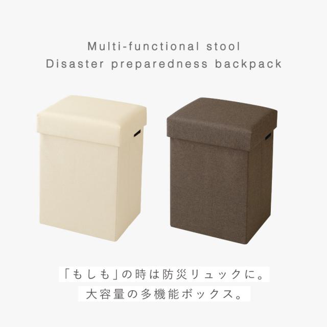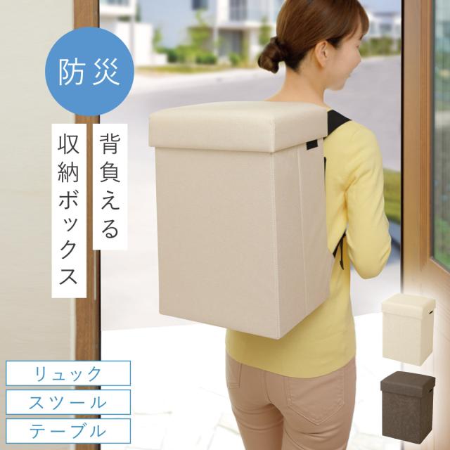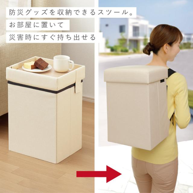 いつもは、スツール・テーブル・オットマン・収納ボックス、「もしも」の時は、防災リュックとして使える多機能ボックス。普段から防災用品を目につくところに保管でき、万一の時に背負って逃げることができます。