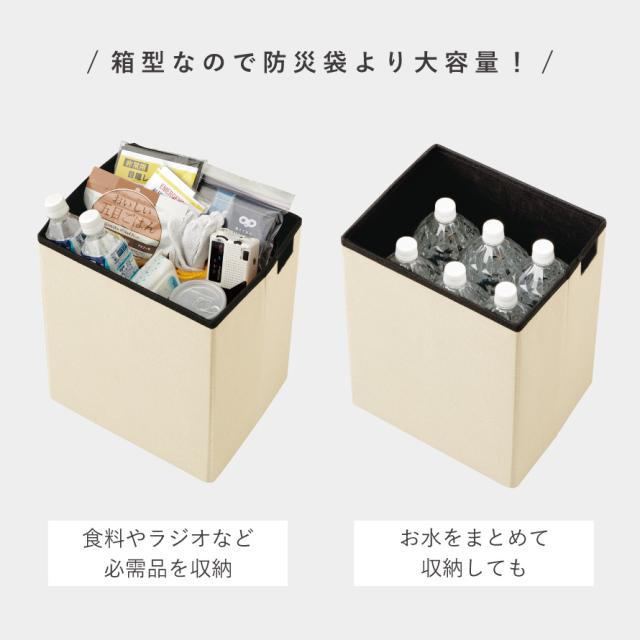 避難先でもスツールやテーブルとして使用でき、食事の場面などで避難所生活をお助けします。一般的な防災袋に比べて、箱型なのでたくさん収納できます。