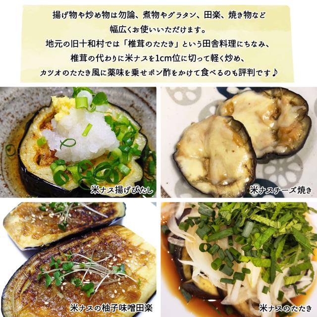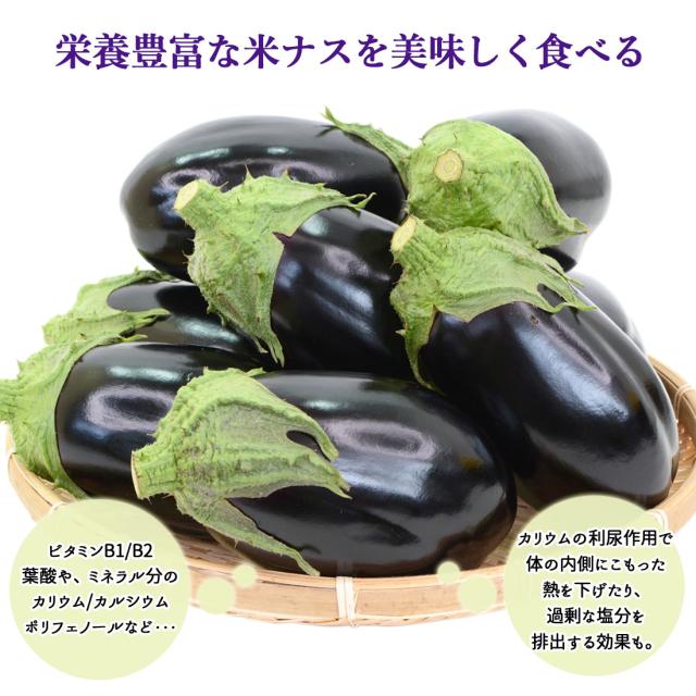 米ナスにはビタミンやミネラル、ポリフェノールなどの栄養をバランスよく含んでいる超優良お野菜。揚げ物や炒め物は勿論、煮物やグラタン、田楽、焼き物など幅広くお使いいただけます。