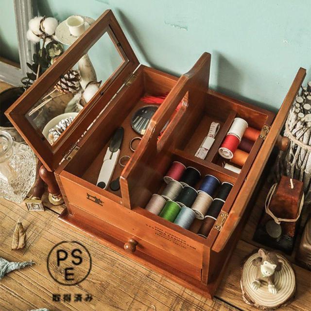 裁縫箱 ソーイングキット、レトロな木製ソーイングバスケット、ポータブルソーイングボックス、引き出しタイプのデスクトップ収納ボックス、ホリデ
