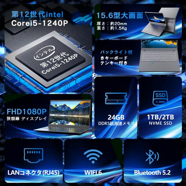 【新品】高性能ゲーミングノートパソコン Corei5 1240P 15.6インチ 第12世代 メモリ24GB SSD1TB/2TB Windows11 Office付 初期設定済 WEBカメラ バックライト