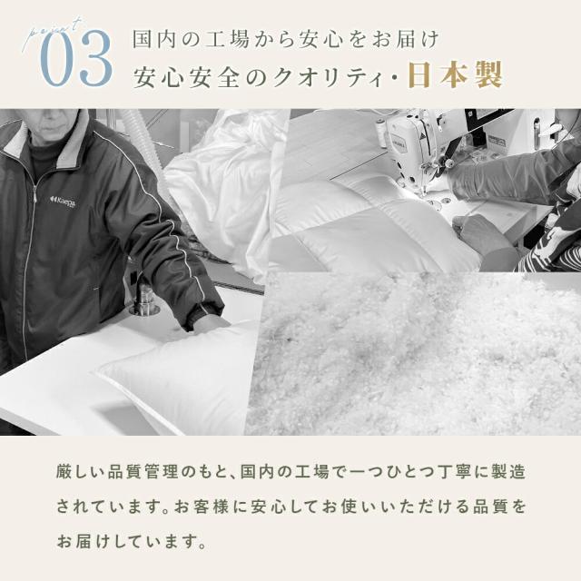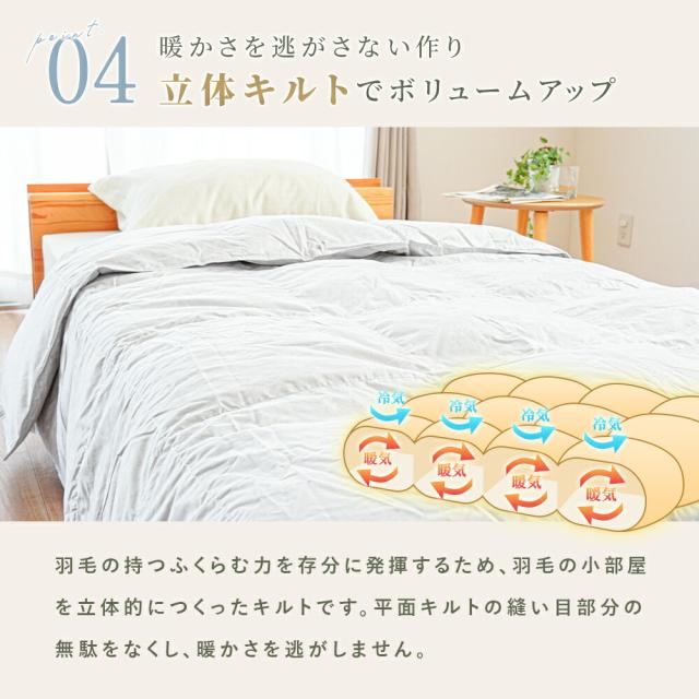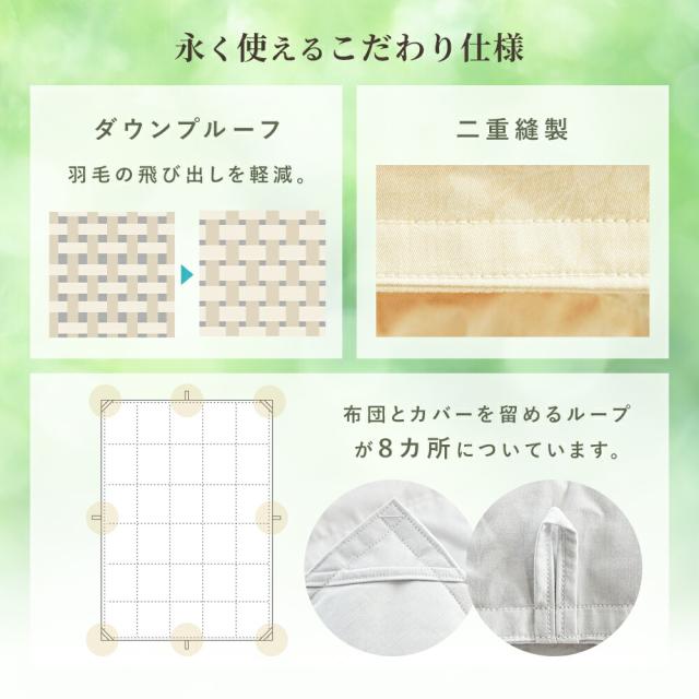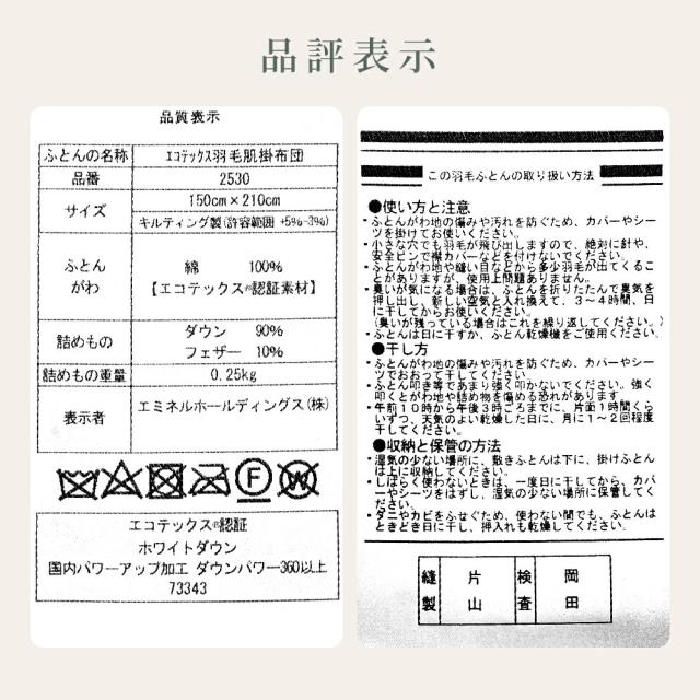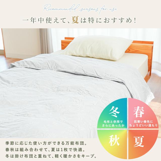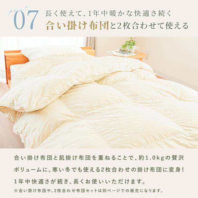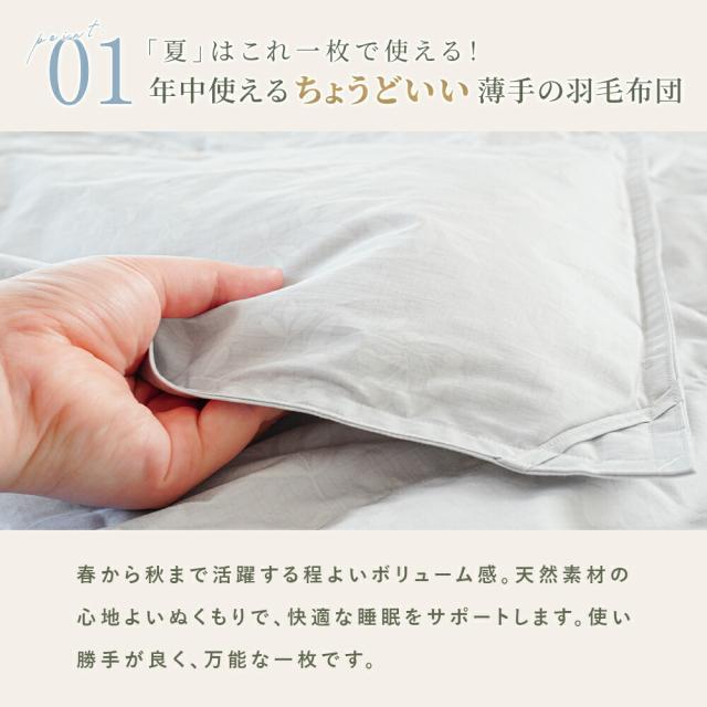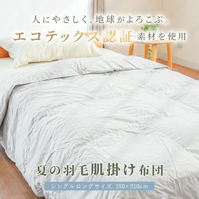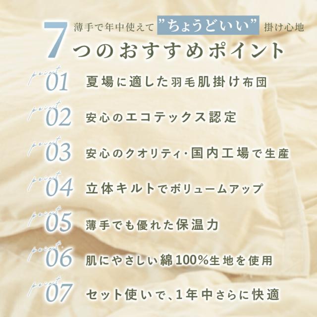 | ・「夏」はこれ一枚で使える!年中使えるちょうどいい薄手の羽毛布団 春から秋まで活躍する程よいボリューム感。天然素材の心地よいぬくもりで、快適な睡眠をサポートします。使い勝手が良く、万能な一枚です。 ・世界最高水準の安全性を誇る、エコテックス(R)認証素材を使用生地や中の羽毛だけでなく縫い糸・マチテープ・品評表示にいたるまで製品に使われる全ての部材が認証をクリアし、安心・安全、環境にも配慮した羽毛布団に仕上がりました。 ・エコテックスとは? エコテックス(R)は、人と地球にやさしい繊維製品の証。原料から製造工程まで安全性を厳しくチェックし、未来の環境やこどもたちを守ります。毎日身体に触れるものだからこそ、安心・安全な世界最高水準の羽毛布団を選びませんか? 厳しい品質管理のもと、国内の工場で一つひとつ丁寧に製造されています。お客様に安心してお使いいただける品質をお届けします。 ・暖かさを逃がさない作り。立体キルトでボリュームアップ羽毛の持つふくらむ力を存分に発揮するため、羽毛の小部屋を立体的につくったキルトです。平面キルトの縫い目部分の無駄をなくし、暖かさを逃がしません。 ・ダウン90%で詰め物量0.25kg!薄手でも適度な保温力軽やかな掛け心地と確かな暖かさを実現。薄手ながらも、優れた保温性を発揮。薄手でもしっかりとした保温力を求める方や、エアコンの寝冷え対策などにおすすめです。 ・人肌にやさしく、天然素材の心地よさ。綿100%生地で吸湿性を確保吸湿性に優れた綿100%の側生地を使用。汗や湿気をしっかり吸い取り、さらっと快適。天然素材ならではのやさしい肌触りで、敏感肌の方にも安心です。 ・長く使えて、一年中暖かな快適さ続く。肌掛けと2枚合わせて使える合い掛け布団と肌掛け布団を重ねることで、約1.0kgの贅沢ボリュームに。寒い冬でも使える2枚合わせの掛け布団に変身!1年中快適さが続き、長くお使いいただけます。 | |