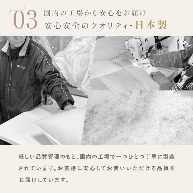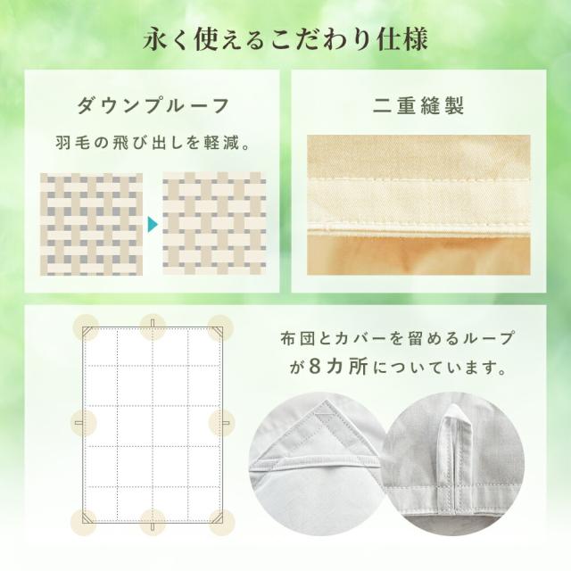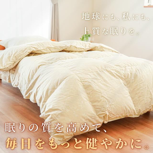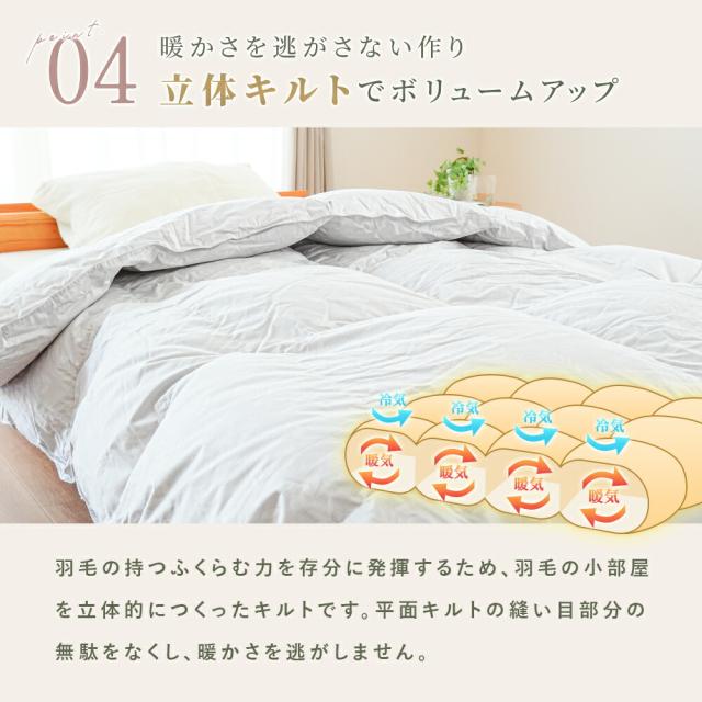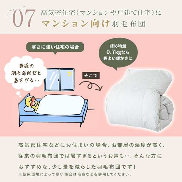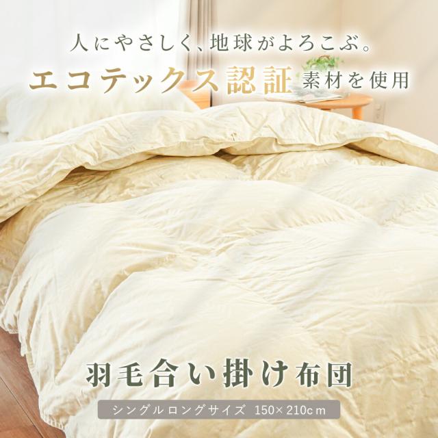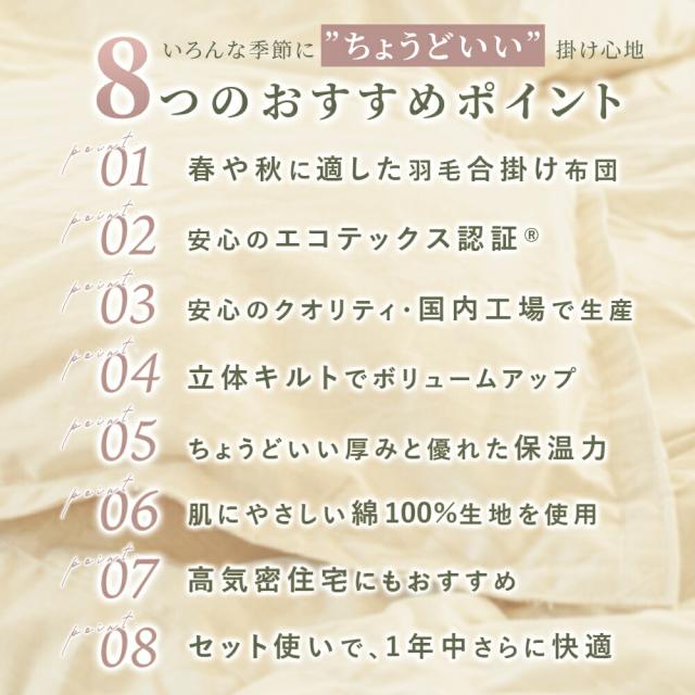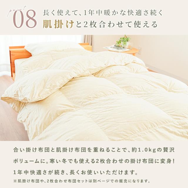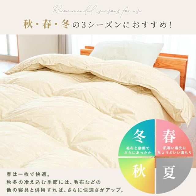 | ・こんな厚みが欲しかった…。中厚タイプの”ちょうどいい”羽毛布団 秋〜初冬や、晩冬〜春のおふとん選びが難しい時期に適した合い掛けタイプ。肌掛けでは物足りないけど、冬掛けでは暑すぎる…。そんな季節の変わり目にもぴったりな一枚です! ・世界最高水準の安全性を誇る、エコテックス(R)認証素材を使用生地や中の羽毛だけでなく縫い糸・マチテープ・品評表示にいたるまで製品に使われる全ての部材が認証をクリアし、安心・安全、環境にも配慮した羽毛布団に仕上がりました。 ・エコテックスとは? エコテックス(R)は、人と地球にやさしい繊維製品の証。原料から製造工程まで安全性を厳しくチェックし、未来の環境やこどもたちを守ります。毎日身体に触れるものだからこそ、安心・安全な世界最高水準の羽毛布団を選びませんか? 厳しい品質管理のもと、国内の工場で一つひとつ丁寧に製造されています。お客様に安心してお使いいただける品質をお届けします。 ・暖かさを逃がさない作り。立体キルトでボリュームアップ羽毛の持つふくらむ力を存分に発揮するため、羽毛の小部屋を立体的につくったキルトです。平面キルトの縫い目部分の無駄をなくし、暖かさを逃がしません。 ・ダウン90%で詰め物量0.7kg入り。ちょうどいい厚みと優れた保温力ダウン90%配合で軽く、しっかりと暖かさを保ち、優れた保温性を発揮。冬でも暖かくなってきた現代にぴったりで、暑がりの方や高気密住宅・温暖な地域にお住まいの方にも最適。 ・人肌にやさしく、天然素材の心地よさ。綿100%生地で吸湿性を確保吸湿性に優れた綿100%の側生地を使用。汗や湿気をしっかり吸い取り、さらっと快適。天然素材ならではのやさしい肌触りで、敏感肌の方にも安心です。 ・高気密住宅(マンションや戸建て住宅)にマンション向け羽毛布団高気密住宅などにお住まいの場合、お部屋の湿度が高く、従来の羽毛布団では暑すぎるというお声も…。そんな方におすすめな、少し量を減らした羽毛布団です! 合い掛け布団と肌掛け布団を重ねることで、約1.0kgの贅沢ボリュームに。寒い冬でも使える2枚合わせの掛け布団に変身!1年中快適さが続き、長くお使いいただけます。 | |