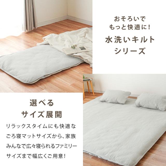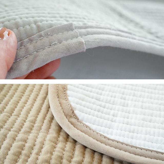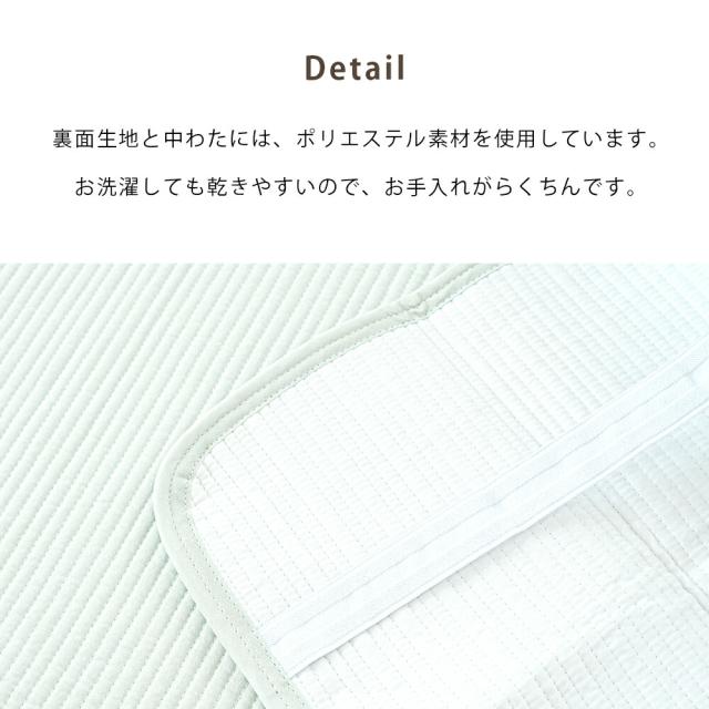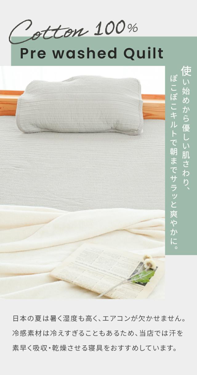 | ・汗をかいてもベタつきにくい 凹凸のある細かなポコポコキルトは、お肌との接地面が少ないので蒸れにくく気持ちいい。 お肌に直接触れる表生地に、天然素材の綿を使用。 先に一度、水を通した生地で作りました。 コンパクトに折りたためて、ご家庭でお洗濯OKだから毎日清潔にお使いいただけます。 枕パッドに付いている2本のゴムを枕に通してしっかりと固定。取り外し簡単で、お洗濯もすぐできます! | |