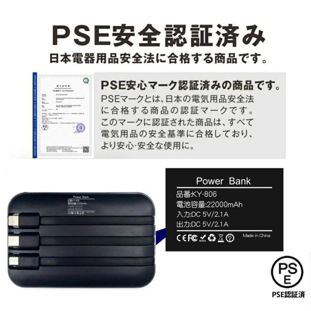 | スペック | 商品名: ミニ・大容量モバイルバッテリー バッテリー容量: 20,000mAh 入力: DC5V2.1A 出力: DC5V2.1A/PD22.5W 5V2.1A高速充電 届出事業者名:三木一雄株式会社 PSマークの種類:PSE パッケージ内容: 1 x モバイルバッテリー本体 1 x 日本語取扱説明書 PSE認証: PSEマーク取得済み |