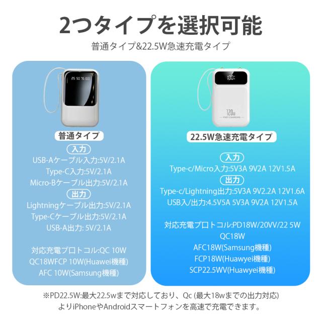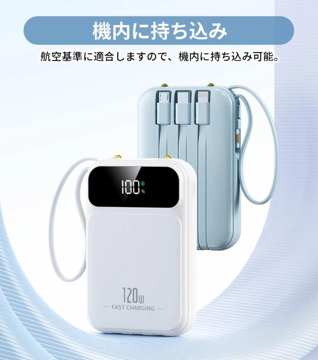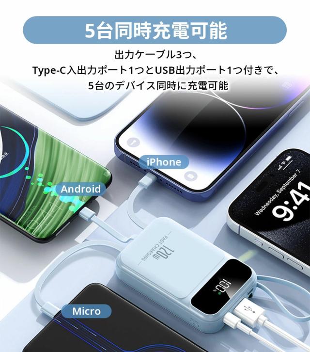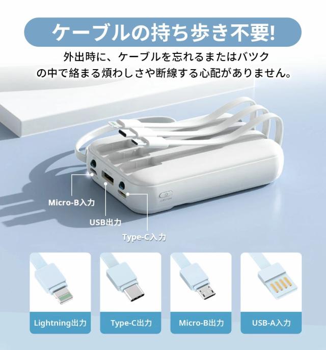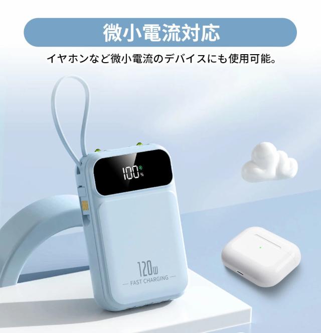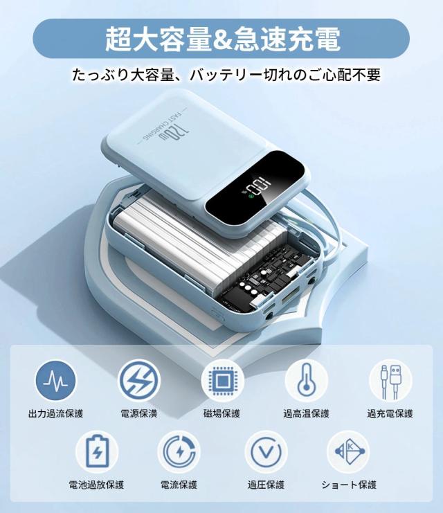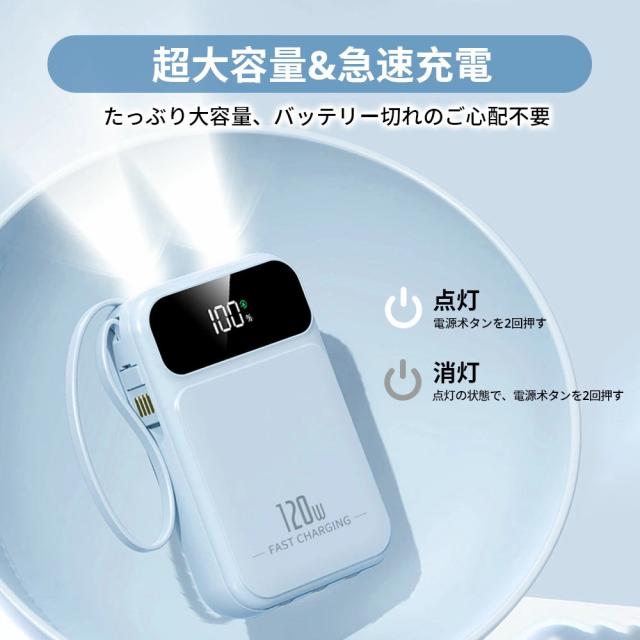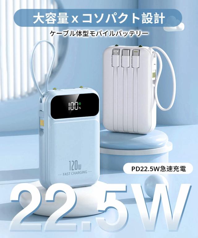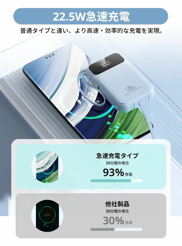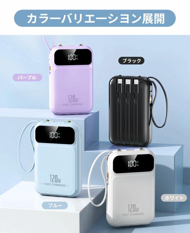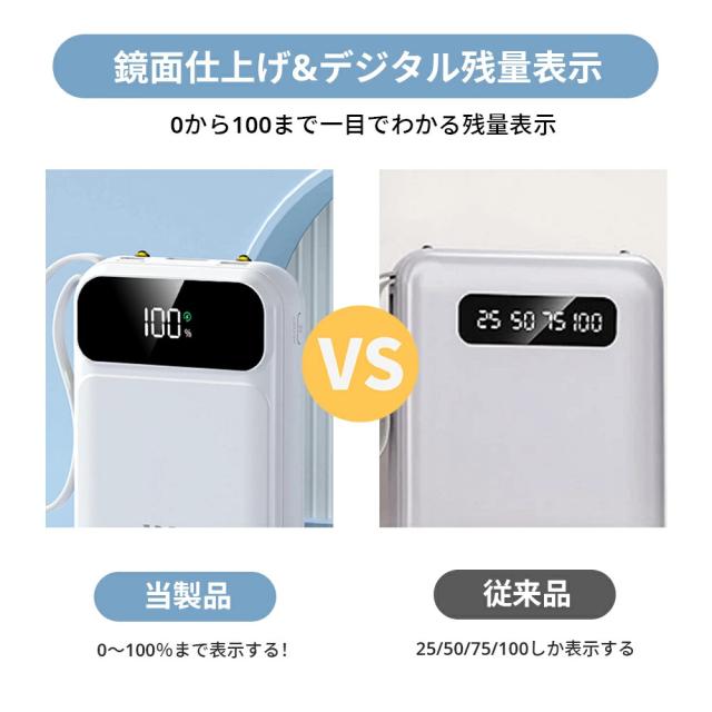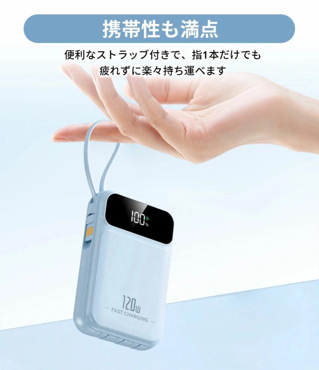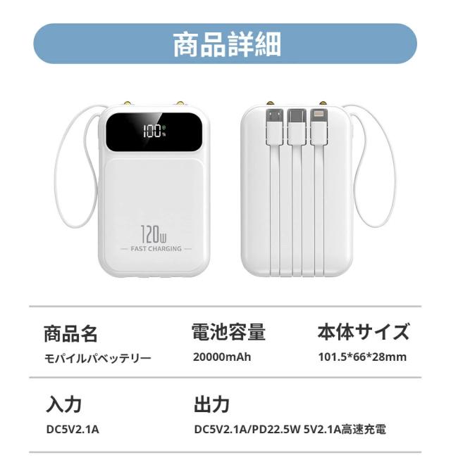 | オススメポイント | 22.5W高速充電対応: 最大22.5Wの出力で、SCP&PD22.5W/20W&QC18W対応でき、充電スピードを約4倍アップできます! 超ミニ・コンパクトサイズ: バッグやポケットに入れても、スペースを取らず、内蔵ケーブルをストラップとしてもご利用可能!持ち運びに便利! 5台デバイス同時充電: 4つの内蔵ケーブルと出力接続口を使えば、5台のデバイスを同時に充電することができます。ケーブルを無駄に持ち歩く心配がなく、1台であらゆるデバイスを対応! 鏡面の仕上げLED残量表示: 高級感のある鏡面仕上げ&LEDディスプレイで、バッテリー残量が一目で確認できます。充電のタイミングを逃さず、効率的に使えます! 多重保護システム搭載: 安心の回路設計と安全の知能チップ搭載で、デバイスのバッテリー充電を高速・安全に提供できます! 多機能・便利: 充電と同時にLEDライト機能も搭載しており、暗い場所でも簡単に使用できます。デザインも洗練されており、オフィスやカジュアルなシーンでもおしゃれに使えます! |