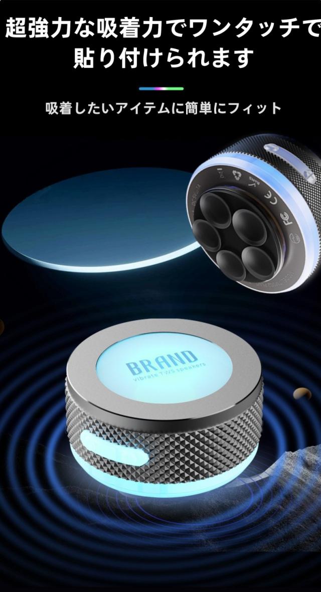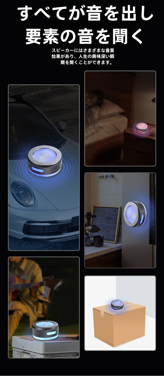 このポータブルワイヤレススピーカーは、骨伝導技術と振動スピーカーを組み合わせており、さまざまな素材の表面に吸着させて使用できます。壁やガラス、木材などに貼り付けることで、素材ごとに異なる音楽効果を楽しむことができます。