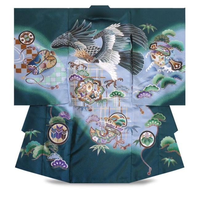 男児 熨斗目 レンタル お宮参り 着物 帽子 よだれかけ セット【貸衣装 和服 祝い着 初着 産着 往復送料無料】濃緑 グリーン系 鷹 初着