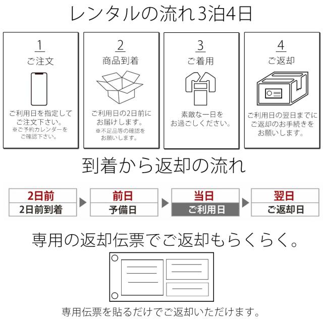 ●レンタル期間:3泊4日(商品はご着用日の2日前に到着するよう発送致します。)