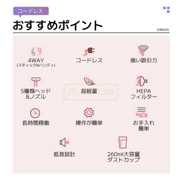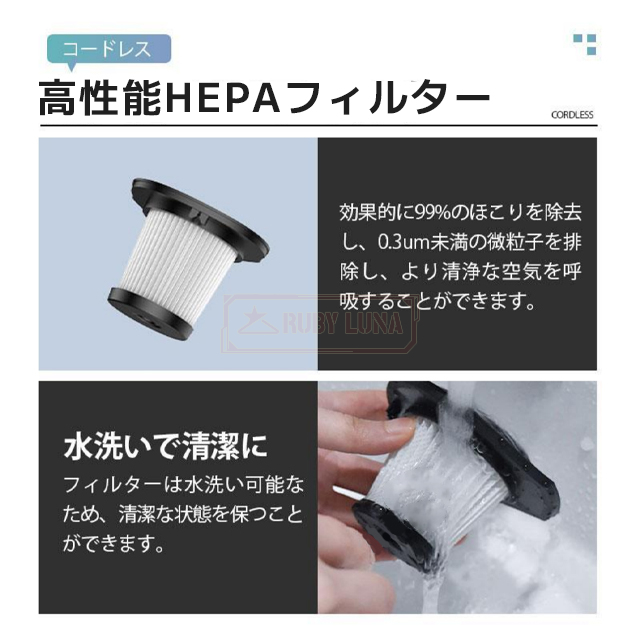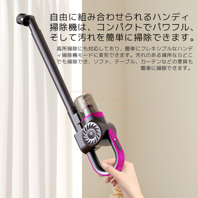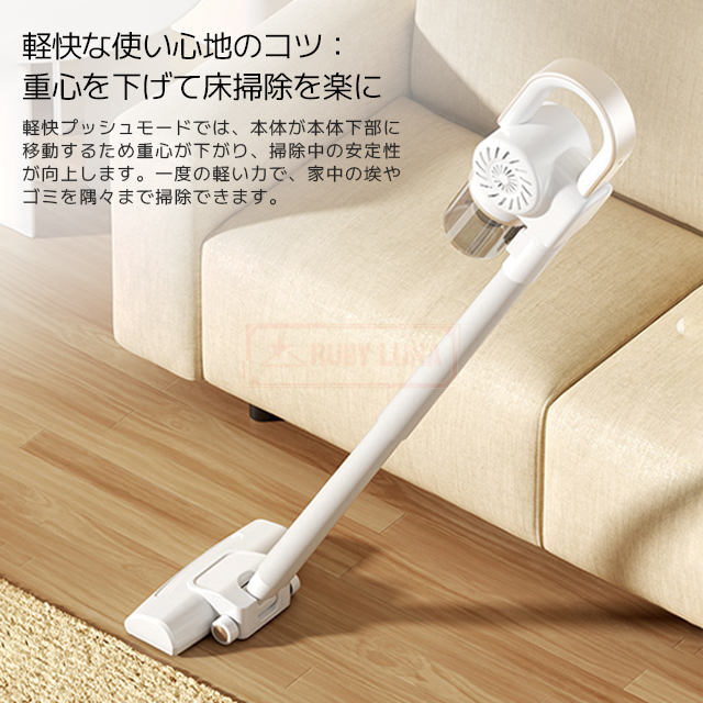 | 【 女性でも取り扱い簡単】 | ◆軽量で持ち運び便利なコードレス掃除機!女性でも無理なく扱えます。 |