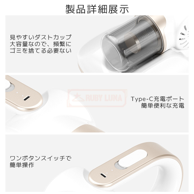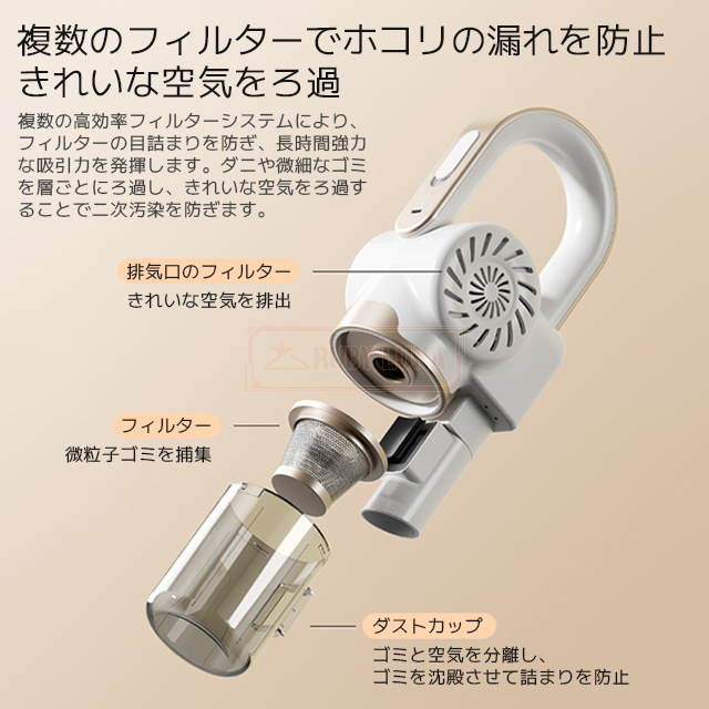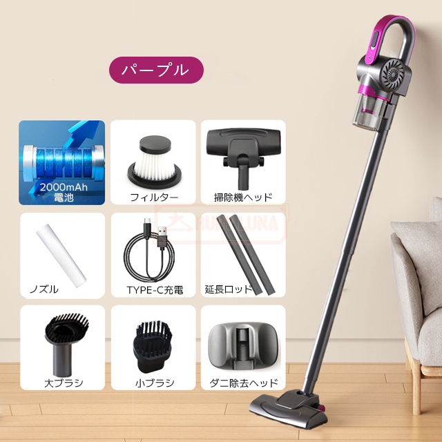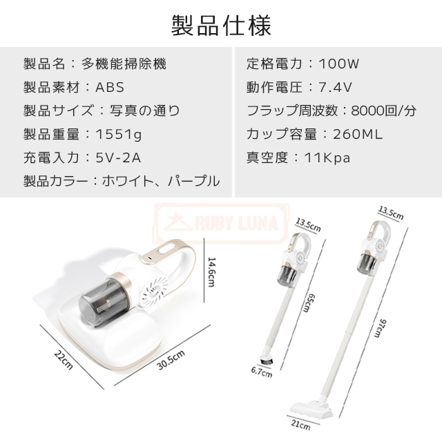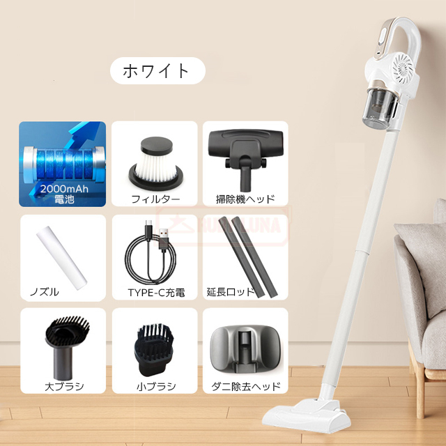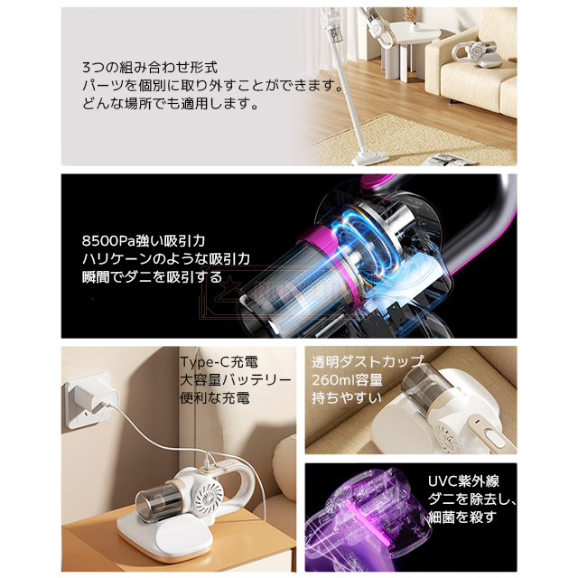 | 付属品 | ◆フィルター*1、掃除機ヘッド*1、ノズル*1、TYPE-C充電*1、延長ロッド*1、大ブラシ*1、小ブラシ*1、ダニ除去ヘッド*1 |