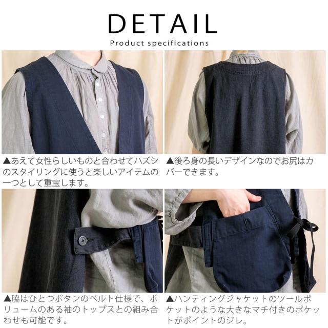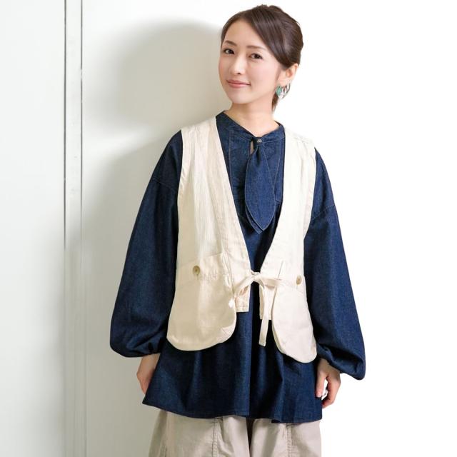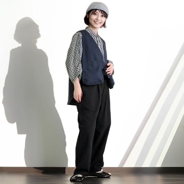 ワーク感のあるヘリンボンツイル生地とワーク感のあるポケットが特徴的なジレは、あえて女性らしいものと合わせてハズシのスタイリングに使うと楽しいアイテムの一つとして重宝します。