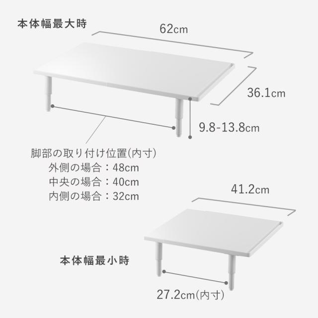 ■内寸サイズ:天板/幅39.5〜60.3×奥行35.7cm 脚(アジャスター部)の間隔/本体幅最小時27.2cm 本体幅最大時48cm・40cm・32cm