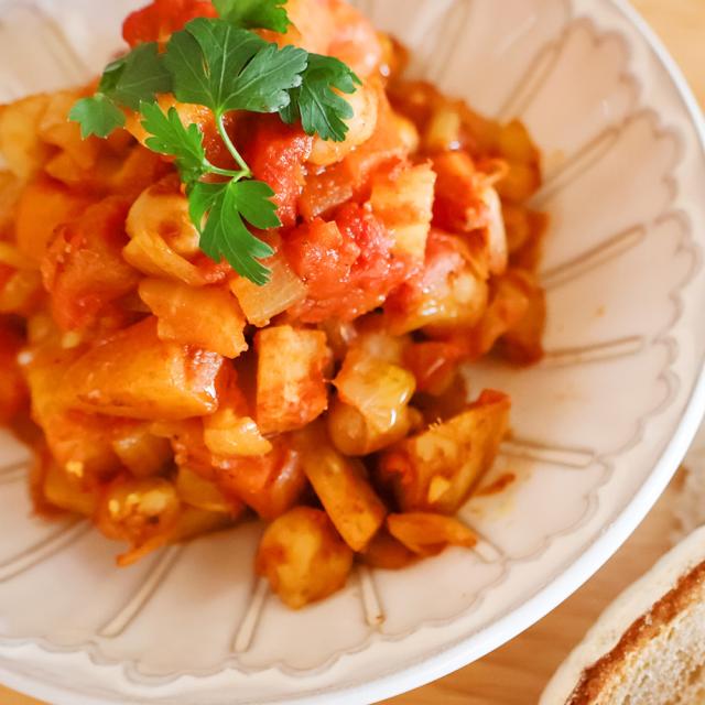 | おすすめレシピ ひよこのスパイシートマト煮 ホットチリペッパーパウダーでスパイシーに仕上げたひよこ豆のトマト煮。