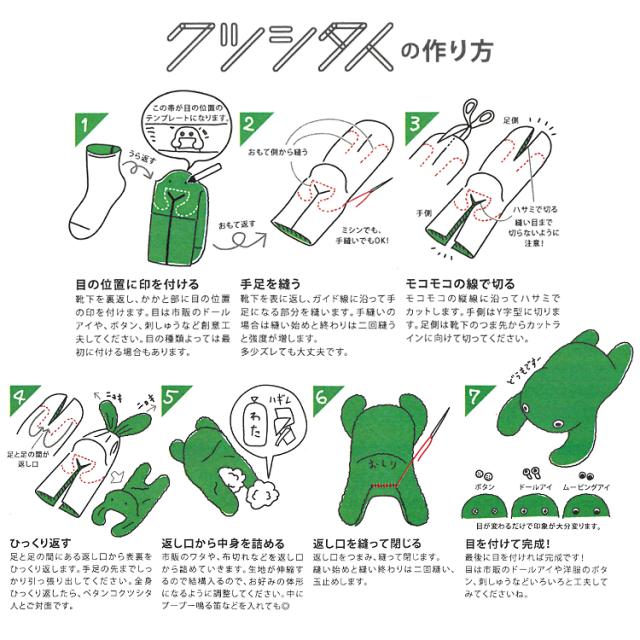 目は手芸屋さんで買えるボタン・ドールアイ・ムービングアイなどを使って、自分だけのクツシタ人を作っちゃおう!
