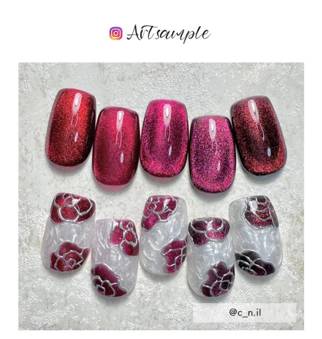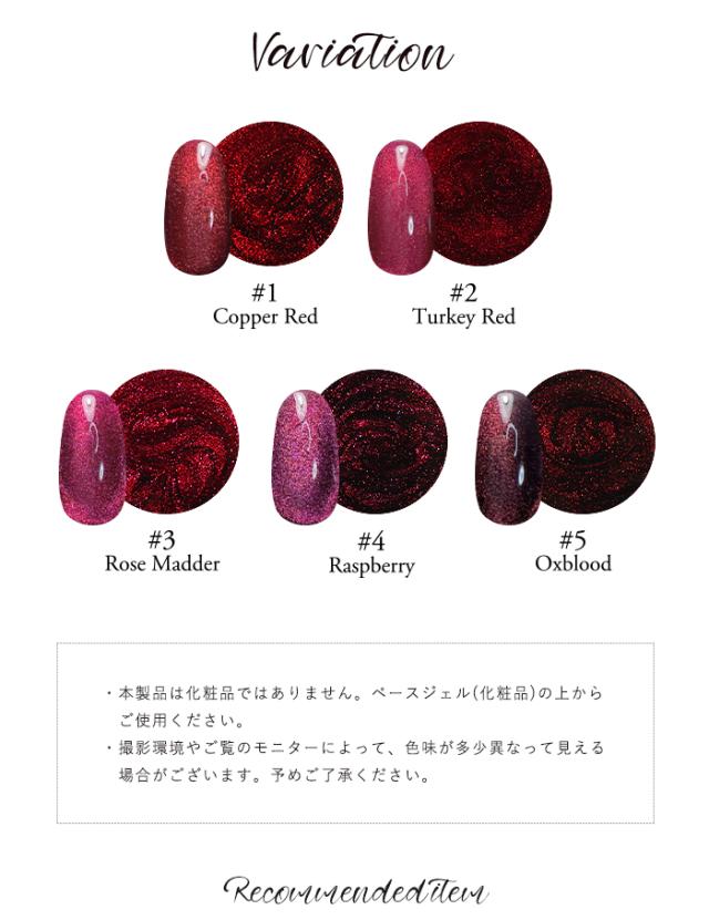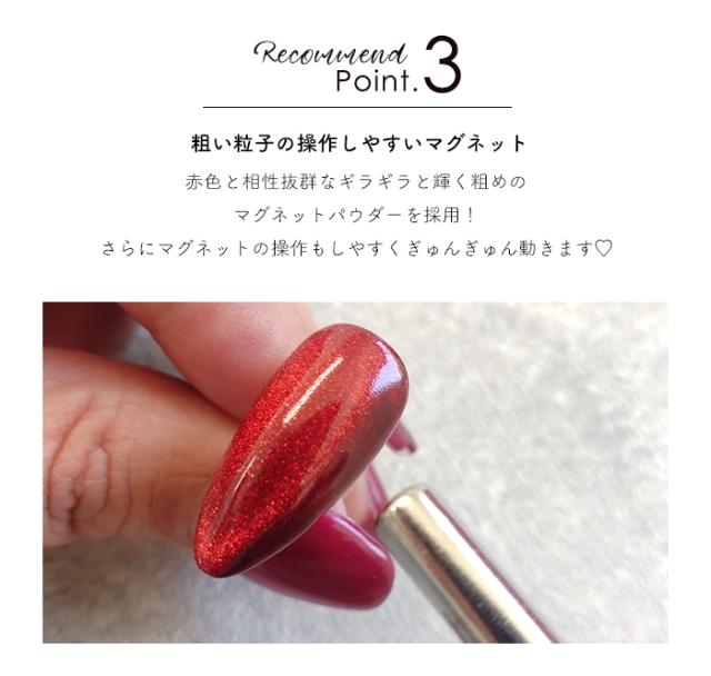 赤好きが赤好きさんのために選んだレッドマグネットジェル。 幅広い赤好きさんに刺さる5色のカラーバリエーションをご用意! 鮮やかな赤色から深い赤色までベースカラーにもこだわりました◎ さらに、ベースカラーに負けない赤系マグネットパウダーも厳選して配合! ギラギラとした粗い粒子のマグネットが、より赤色を際立たせ ゴージャスな爪先に♪ 今日こそは!っと、気合を入れたい時におすすめしたいマグネットジェルです!! |