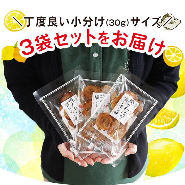 <焼かわはぎ(瀬戸内塩レモン味)×3袋セット> 合計90g(30g×3) 国内仕上げ 小分け 大容量 送料無料 カワハギ 海と太陽 メール便 檸檬 おつまみ おやつ 塩味 ポイント消化 クーポン消化 塩分補給 クリスマス 年末年始