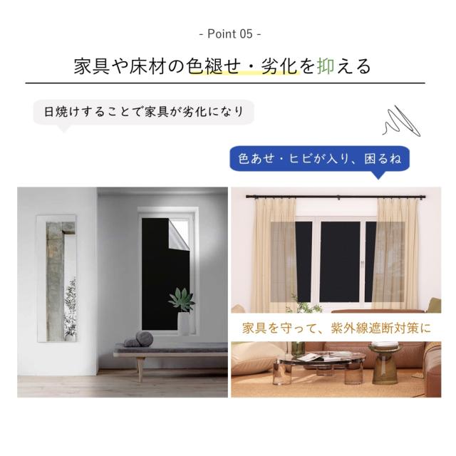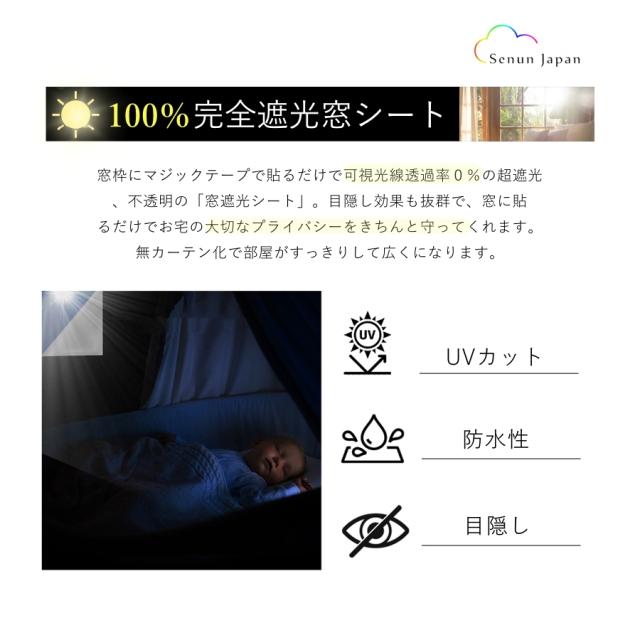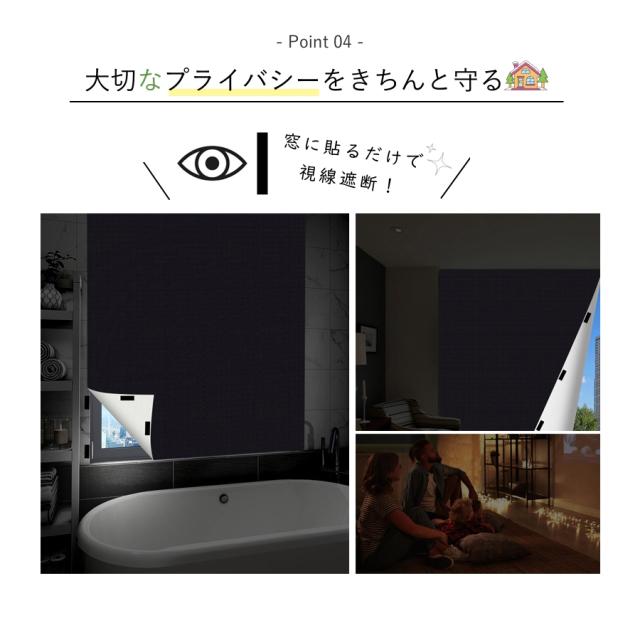 | 【真っ黒・超遮光・目隠し効果】 | 可視光線透過率0%の超遮光、不透明の遮光シートです。赤ちゃん、昼夜逆転の方、光に敏感な方の部屋に最適な窓ガラス目隠しシートです。目隠し効果も抜群で、窓に貼るだけでお宅の大切なプライバシーをきちんと守ってくれます。無カーテン化で部屋がすっきりして広くになります。 |