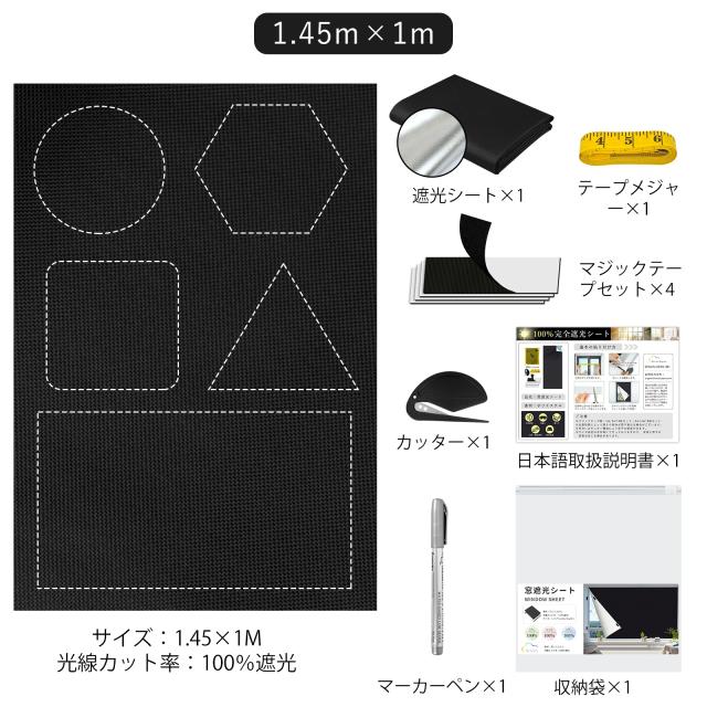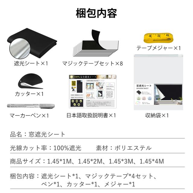 内容物:遮光シート*1、マジックテープ(1m/2m*4セット;3m/4m*8セット)、ペン*1、カッター*1、メジャー*1