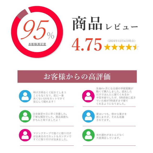| 【品質保証】 | SENUN製品は日本企業が企画開発・検品・販売・サポートを行なっております。 遮光シートを出荷する前には、専任のスタッフが入念な検品を行います。 私たちは「購入するまで」ではなく、「購入してから」がお付き合いの始まりと考えます。サポートも随時受け付けておりますので、安心して快適にお使いいただけましたら幸いです。商品に関するご質問がありましたら、いつでもお気軽にお問い合わせくださいませ。 |