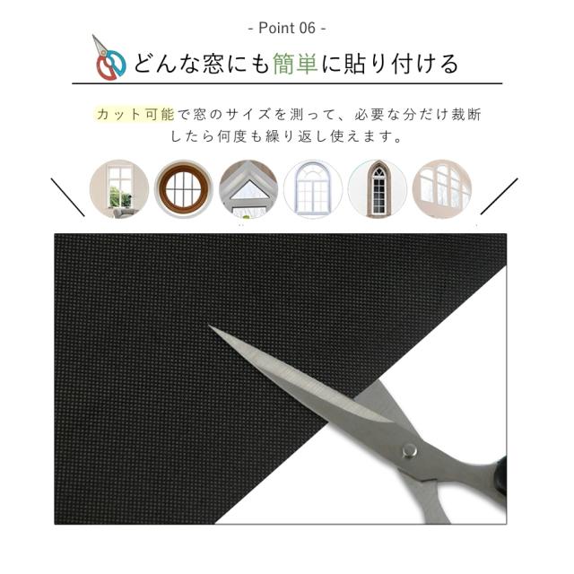 | 【取り付けはもっと便利に】 | 水不要・接着剤不要・貼り直し不要。付属のマジック両面テープが付いて、どんな窓にも簡単に貼り付けることができます。窓のサイズを測って、必要な分だけ裁断したら何度も繰り返し使えます。 |