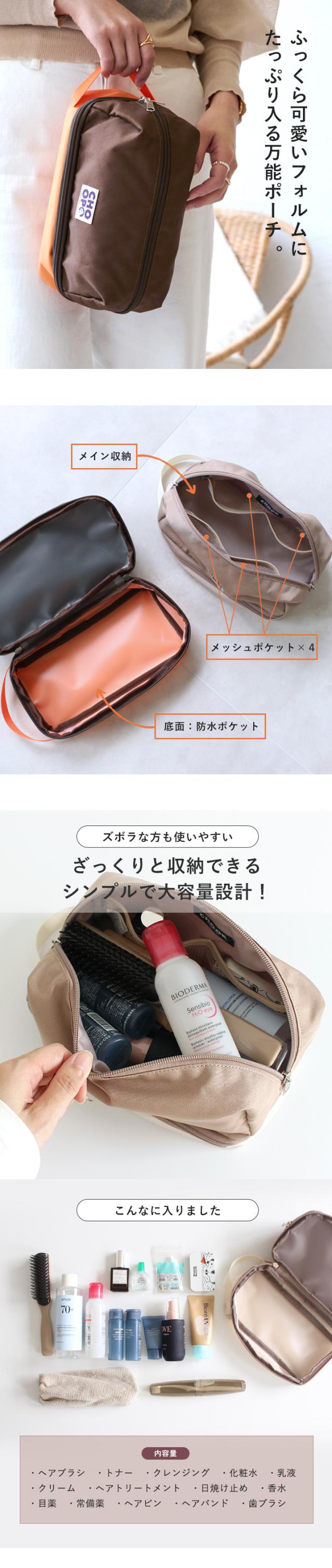 普段使いのそのまま入る!ざっくり収納が叶う 防水ポケット付きの大容量トラベルポーチ。 ふっくらと丸みのある可愛いフォルムに持ち手 ハンドルも付いているので持ち運びもらくらく。 メイン収納はガバっと開いてざっくりと収納できる シンプルな設計。内側にメッシュポケットも付いて いるので小さなアイテムも仕分け可能。底面は 防水ポケットになっているので洗顔ネットやヘアバンド など濡れたものもそのまま収納できて便利。 旅行から普段使い、お子様用品の収納にもおすすめ!