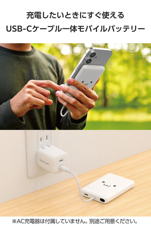 エレコム モバイルバッテリー USB Type-C ケーブル一体 5000mAh 12W リチウムイオン電池 USB-Cケーブル一体 しろちゃん ┃DE-C62-5000WF