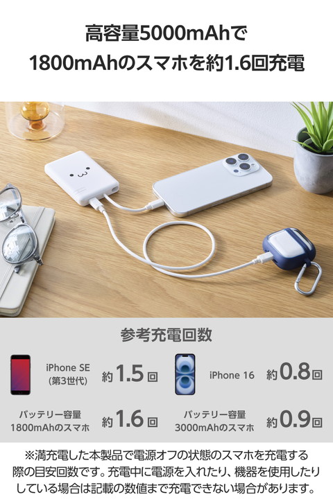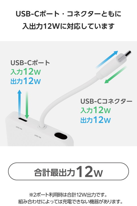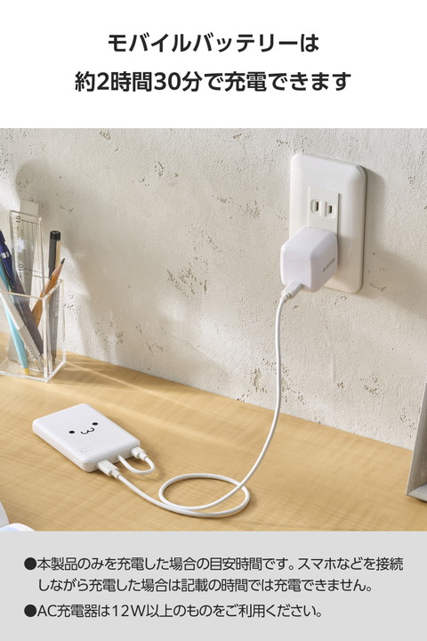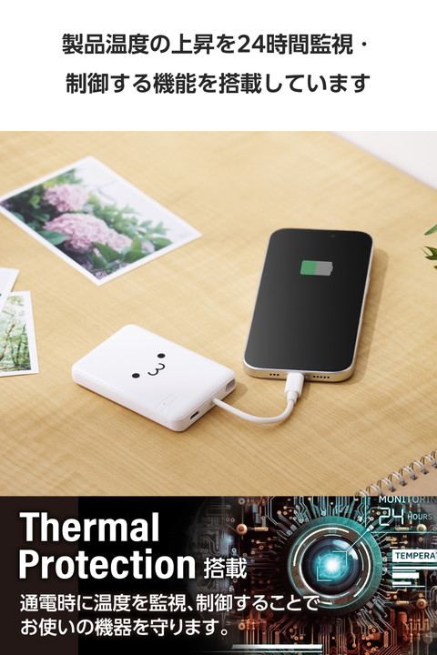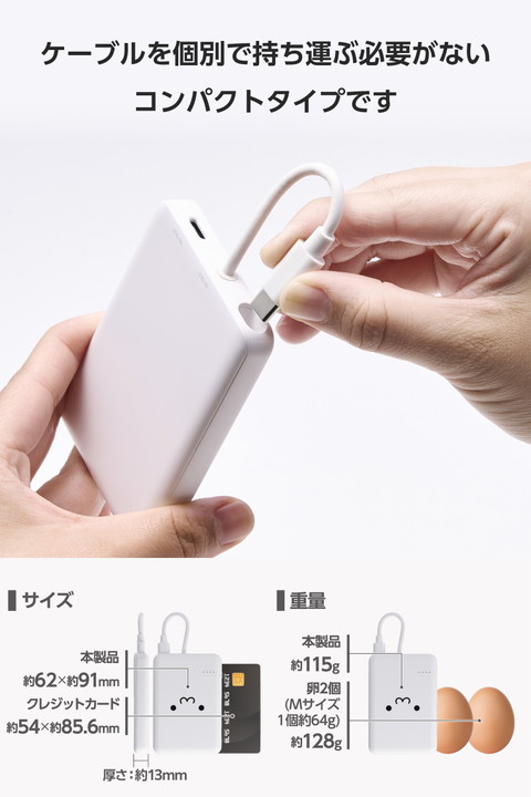 ケーブル一体型だから、思い立ったらすぐ使える。スマートフォンを使いながら充電するのに便利な、ケーブル一体型のモバイルバッテリーです。持ち運びに便利なコンパクトサイズで、最大12Wの出力。外出先での急なバッテリー切れの際も安心です。かわいいしろちゃんモデルです。![]() ■本体にケーブルが付属した、ケーブル一体型のモバイルバッテリーです。 ■ポーチや小さなバッグにも収まるコンパクトサイズ。ケーブルをわざわざ持ち運ぶ必要がないので、お出かけの際の持ち運びにも便利です。 ■最大出力12Wでの充電が可能。本体付属のケーブルからはもちろん、USB Type-Cポートに別途ケーブルを接続して2ポート同時充電も可能です。 ■本製品(バッテリー容量5000mAh)で、1800mAhのスマートフォンを約1.6回、3000mAhのスマートフォンを約0.9回充電可能です。 ■※満充電した本製品で電源オフの状態のスマートフォンを充電する際の目安回数です。充電中に電源を入れたり、機器を使用したりしている場合は記載の数値まで充電できない場合があります。 ■スマートフォンなどのデバイスへの充電と、本製品への充電も同時に行える“まとめて充電”に対応しています。 ■※同時接続時は、スマートフォンへ優先的に充電されます。スマートフォンの充電が完了すると本製品に充電されます。 ■約2時間30分で本製品の満充電が可能。AC充電器に本体付属のケーブルを直接挿して充電できます。 ■※本製品のみを充電した場合の目安時間です。スマートフォンなどのモバイル機器を接続しながら充電した場合は記載の時間では充電できません。 ■約500回繰り返し使用可能な充電式リチウムイオン電池を搭載しています。 ■内蔵の充電式リチウムイオン電池は、JIS C8711およびJIS C8712(JIS C8714の内容を含む)に準拠した安全設計です。 ■Thermal Protectionを搭載し、製品温度の上昇を24時間監視・制御。自動で出力をコントロールし、お使いの機器を守ります。 ■日本の電気用品安全法(PSE)の技術基準に適合した安全性の高い商品です。 ■過充電・過放電・過電流防止機能および短絡保護機能と温度検知機能の5つの保護機能を備えた安心の回路設計です。 ■電池容量が160Wh(43,243mAh)以下であるため、機内持ち込みも可能です。 ※航空会社の規定によって例外がある場合があります。 ■※工場出荷時に70%程度充電されています。充電式リチウムイオン電池は時間とともに放電するので、ご使用になる前に充電することを推奨します。 ■※USB Type-C and USB-C are trademarks of USB Implementers Forum. ■本製品は、一般社団法人JBRCの回収対象製品であり、回収協力自治体や協力店(家電量販店・ホームセンターなど)で回収が可能です。 ■※JBRCのホームページでお住まいの地域の回収協力自治体・協力店をご確認ください。 ■自社環境認定基準を1つ以上満たし、『THINK ECOLOGY』マークを表示した製品です。 ■環境保全に取り組み、製品本体の主たる構成部品や構成要素の原料に占めるリサイクル原料の割合が10%を超えている製品です。 ■環境保全に取り組み、製品の包装容器におけるプラスチック重量を、社内基準製品より20%以上削減した製品です。 ■環境保全に取り組み、製品の包装容器が紙・ダンボール・ポリ袋のみで構成されている製品です。 ![]() ■対応機種:iPhoneおよびUSB端子で充電するスマートフォン、タブレット、他小型電子機器 ■定格入力電圧:USB Type-C(TM)ポート/プラグ(ケーブル部):5V ■定格入力電流:USB Type-Cポート/プラグ(ケーブル部):2.4A ■コネクター形状:USB Type-Cポート×1、USB Type-Cプラグ(ケーブル部)×1 ■定格出力電圧:USB Type-Cポート/プラグ(ケーブル部):5V ■定格出力電流:USB Type-Cポート/プラグ(ケーブル部):2.4A(最大出力12W) ■電池種類:充電式リチウムイオン電池 ■電池定格容量:3.7V/5000mAh 18.5Wh ■充電時間:約2時間30分 ※製品本体のみを充電した場合の目安です。スマートフォンなどのモバイル機器を接続した場合は記載の時間では充電できません。 ■外形寸法:幅約62mm×奥行約13mm×高さ約91mm ■重量:約115g ■カラー:しろちゃん(ホワイト×ブラック) ■くり返し使用回数:500回 ■使用温度範囲:0℃〜40℃ ■電気用品安全法:○PSE 特定以外の電気用品 ■保証期間:1年間 ■その他:Lightningポート搭載の端末で使用する場合は別途Lightningプラグのケーブルをご用意ください。 |