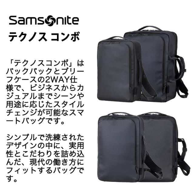 Samsonite テクノス コンボ ツーウェイバッグは、バックパックとブリーフケースの2通りの使い方ができる多機能モデル。高い収納力と整理性、環境に配慮した素材使いで、ビジネスシーンをより快適にサポートします。