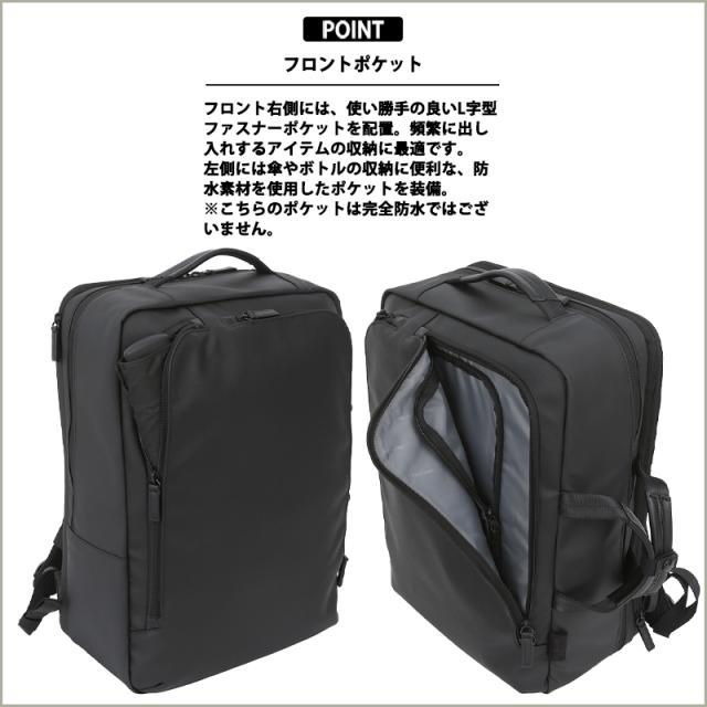 右側にはL字型のファスナーポケット、左側には防水素材(※完全防水ではありません)を使用したポケットを配置。傘やボトルなどの収納に便利です。