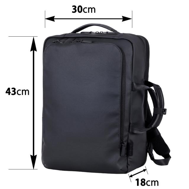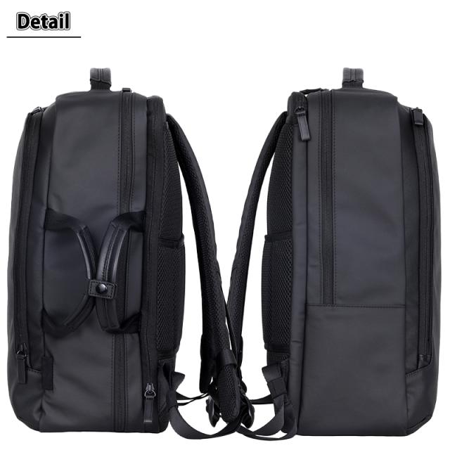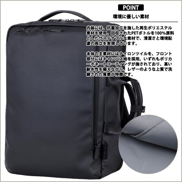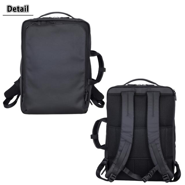 ナイロンツイルとキャンバス地にポリカーボネートコーティングを施し、耐水性と上質なレザー調の風合いを両立。ビジネススタイルにも自然に溶け込みます。