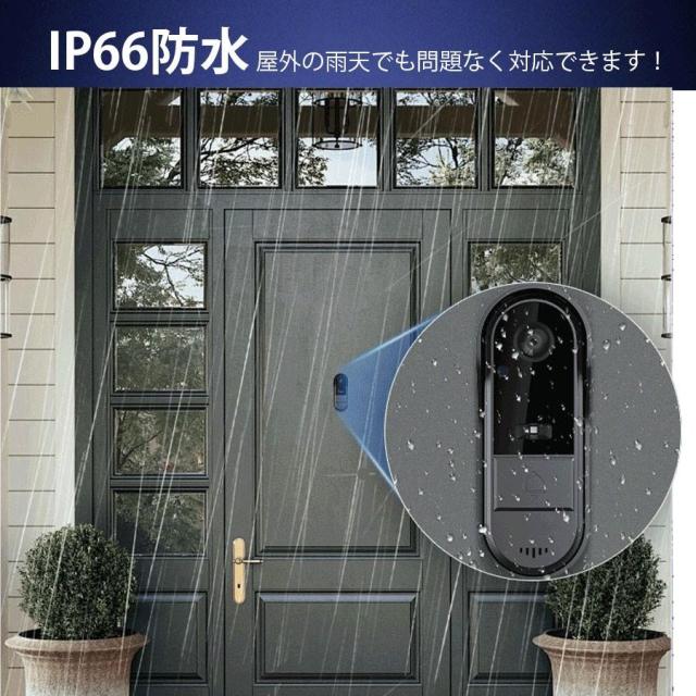ドアカメラに取付枠が装着されており、IP65の防水性能を持ち、屋外での使用や雨天時でも安心して使えるワイヤレスドアホンです。