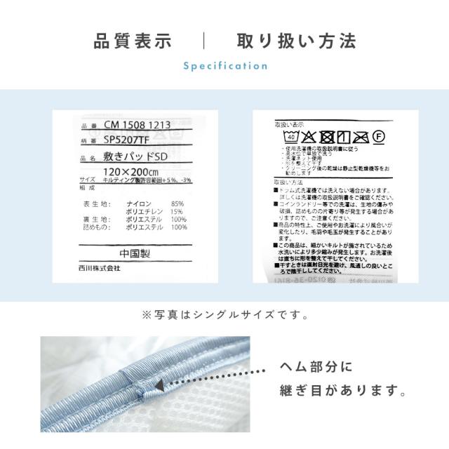 | ・ひんやり素材で夏を快適に 熱伝導率が高い素材を生地に使用。寝返りをするたび体熱を素早く拡散するので、触れるたびひんやり。 ・東洋紡の冷感素材「ツヌーガ®」「ツヌーガ®」は、東洋紡独自の技術により開発された丈夫でホコリが出にくいポリエチレン繊維です。ポリエステル繊維やナイロン繊維に比べ2倍以上の強さ(耐切創性)を示します。また、他の繊維に比べ熱伝導性が高いため、ひんやり感を感じやすくなっています。 ・着脱簡単なゴムバンド付きベッドマットレスにも、敷き布団にも使えます。四隅ゴム付きで着脱がとっても便利。 ・お家で気軽に洗えて清潔汗のかきやすい夏場はとくに汚れが気になるもの。ご家庭でお洗濯OKだから気軽に洗えます。 ・安心の西川品質西川株式会社は、1566年創業の日本有数の寝具メーカー。450年以上の長い歴史がある老舗です。よい睡眠を追求するために、これまでに培った伝統や技術を活かし、また最新の技術を取り入れながら新しい商品を創造しています。眠りや寝具に対するこだわりは強く、そのこだわりの強さが品質の高さに繋がっています。 | |