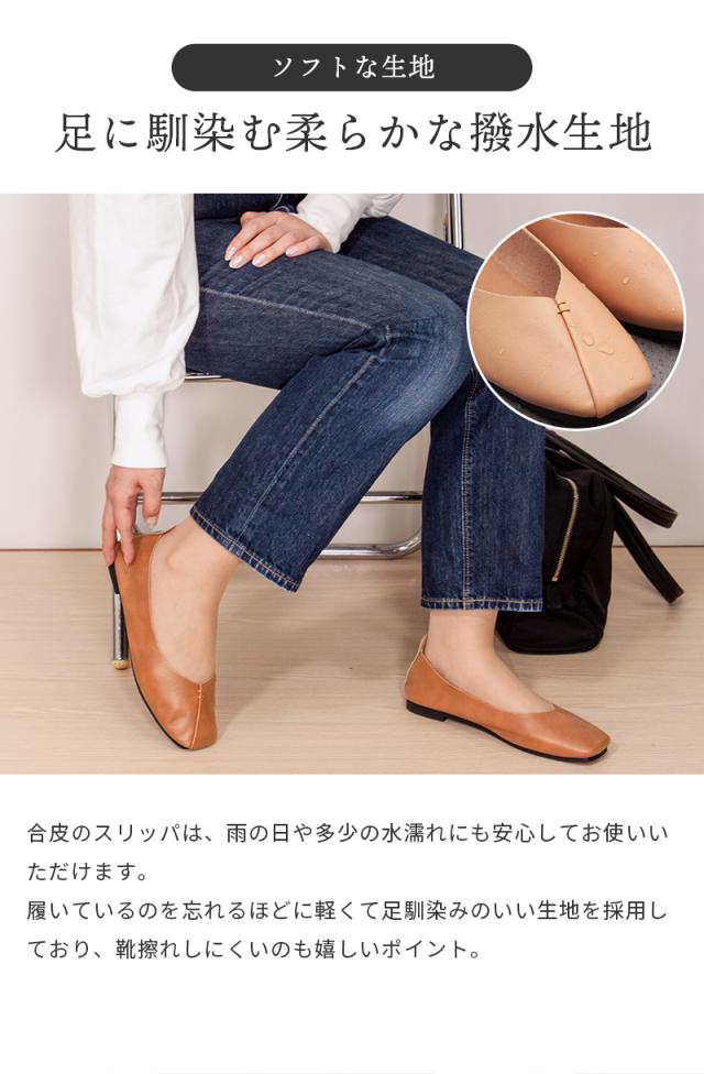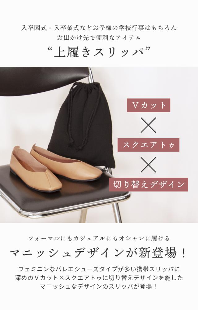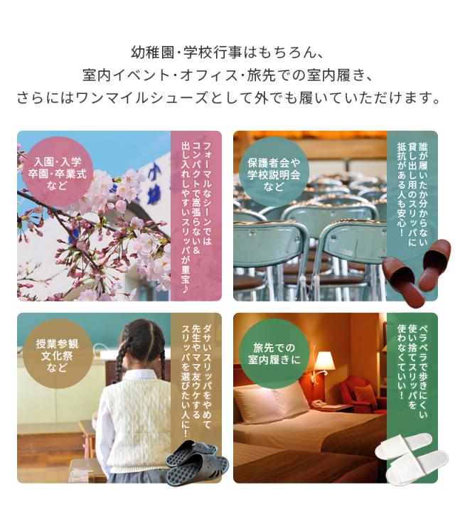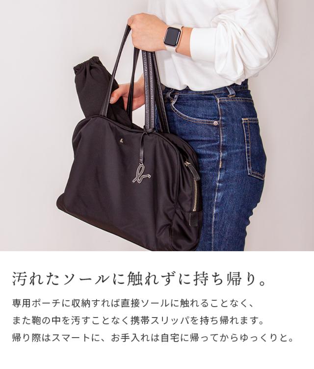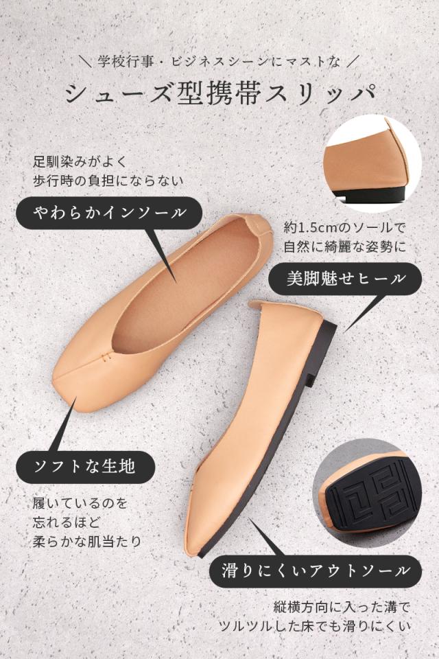 この携帯スリッパは、フォーマルな場面でもカジュアルな場面でも活躍するデザインが魅力です。折りたたまずに収納できるため、手間いらずで持ち運びが簡単です。かかと付きで脱げにくく、約1.5cmの美脚ヒールが足元を美しく演出します。撥水生地を使用しており、多少の雨水濡れにも安心です。パンツスタイルにも合うため、学校行事やビジネスシーンに最適です。レザーライクな素材が高級感を引き立て、Vカットのパンプス風デザインが洗練された印象を与えます。