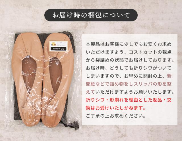 | 注意事項 | ●火気のそばや高温多湿な場所、直射日光の当たる場所には保管しないでください。 ●本来の目的以外でのご使用はおやめください。 ●衛生面上お客様都合による交換返品は出来かねます。 ●本製品はお客様に少しでもお安くお求めいただけますよう、コストカットの観点から 袋詰めの状態でお届けしております。 お届け時、どうしても折りシワがついてしまいますので、 お早めに開封の上、新聞紙などで詰め物をしスリッパの形を整えていただけますようお願いいたします。 折りシワ・形崩れを理由とした返品・交換はお受けいたしかねます。ご了承の上お求めください。 |