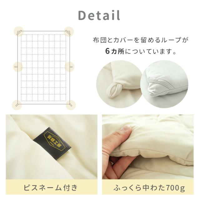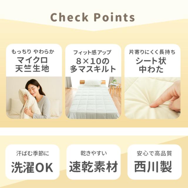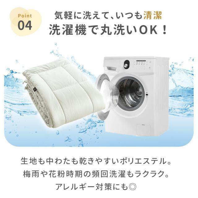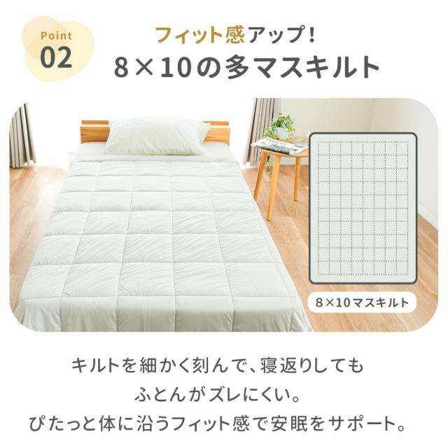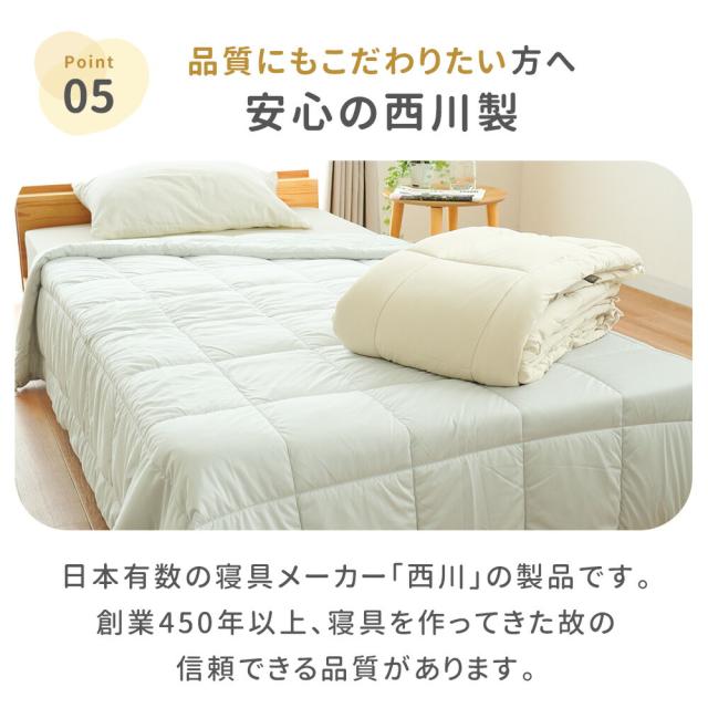 | ・「もっちりやわらか」マイクロ天竺生地 触れた瞬間にわかる伸びのあるしなやかさ。肌が“吸い付く”ような包まれ感で就寝時間に癒しをプラス。 ・フィット感アップ!8×10の多マスキルトキルトを細かく刻んで、寝返りしてもふとんがズレにくい。ぴたっと体に沿うフィット感で安眠をサポート。 ・片寄りにくく、長く使えるシート状中わたふとんの中で綿がかたまりになる「綿切れ」問題を解消。型崩れしにくいから、長く使えてコスパ◎ ・気軽に洗えて、いつも清潔 洗濯機で丸洗いOK!生地も中わたも乾きやすいポリエステル。梅雨や花粉時期の頻回洗濯もラクラク。アレルギー対策にも◎ ・品質にもこだわりたい方へ 安心の西川製日本有数の寝具メーカー「西川」の製品です。創業450年以上、寝具を作ってきた故の信頼できる品質があります。 ・さらに!オールシーズン使える!同シリーズの肌掛け布団と2枚合わせて1年中快適!季節の移り変わりやお部屋の環境に合わせて、肌掛け・合い掛けの2枚合わせで3通りの使い方が可能です! | |