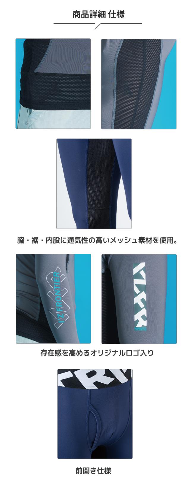●汗をかきやすい脇や裾、内股部分は通気性の高いメッシュ素材を使用