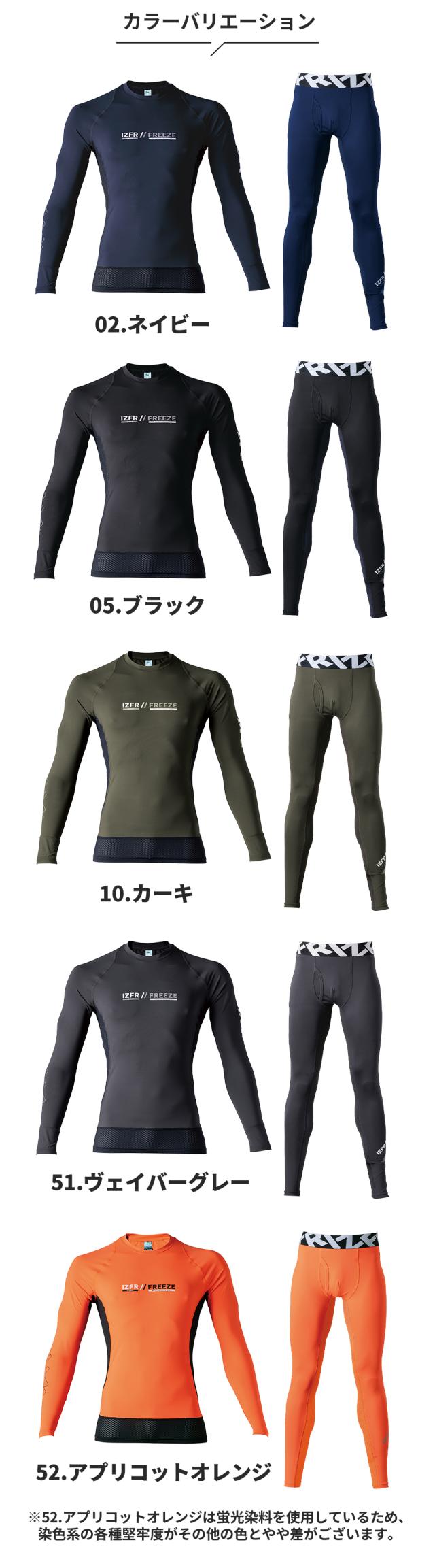 02.ネイビー、05.ブラック、10.カーキ、51.ヴェイパーグレー、52.アプリコットオレンジ