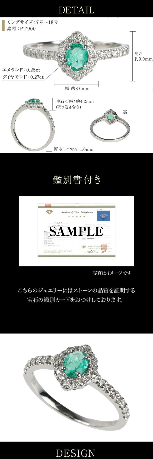 《 商品詳細 》 ●金性 PT900 ●石目 エメラルド:0.25ct ダイヤモンド:0.27ct ●スペック 中石石座(取り巻き含む) 幅:約8.0mm/高さ:約9.0mm/厚み:約4.2mm アーム部分 最大幅:約1.7mm/最小厚:約1.0mm ●サイズ 対応リングサイズ 7号〜18号 サイズ直しは「 ±2号 」までとなります。 お届けより10日以内のみサイズ直し無料! ※それ以上のサイズ直しは、作り変えが必要になりますため、有償になりますのでご留意ください。 ※サイズがご不安な方は、事前にリングゲージを無料で貸し出しております。 ●付属品 ジュエリーBox/鑑別書付き ●納期 商品カゴ上の納期をご確認ください(オーダー対応品)