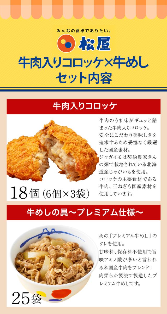 【衝撃の54%OFF!】 松屋 牛めしの具25食と牛肉入りコロッケ18個 (6個×3袋) コロッケ 牛肉 肉 食品 グルメ 冷凍 冷凍食品 送料無料 おかず まつや 受験生応援 惣菜 業務用 お弁当 レンチン お試し 非常食